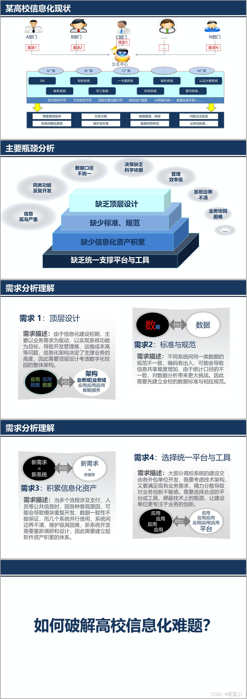 从数字化对高校发展的影响来看,人、物、事通过数字化连接已成趋势,IT 发展的双峰模型与平台化趋势凸显了统一数字化平台的必要性。当前,许多高校存在信息化建设的瓶颈:各部门系统由不同厂商开发,技术架构、开发规范等差异显著,导致信息孤岛严重,数据重复错误、维护成本高、业务创新难等问题突出。这些问题的核心在于缺乏顶层设计、统一标准与规范,以及信息化资产的有效积累。