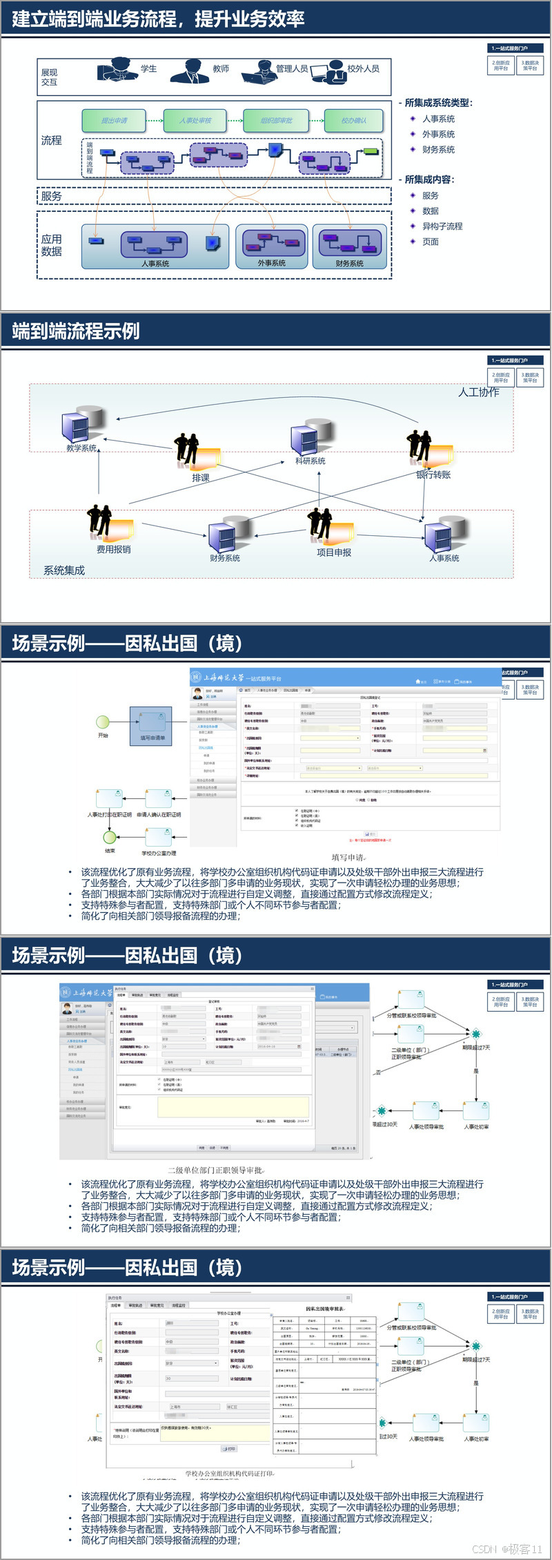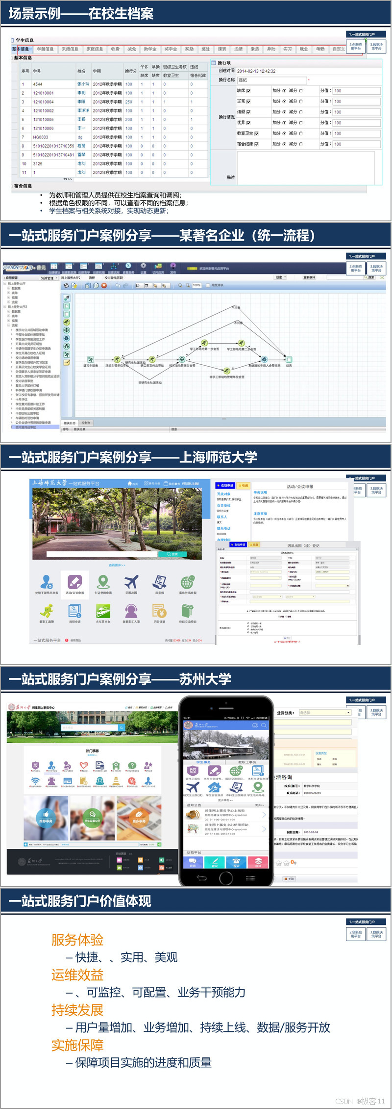 解决方案采用 “一门户、两平台” 的总体架构。一站式服务门户整合各类服务入口,实现单点登录与统一认证,通过端到端流程优化提升效率,如上海师范大学、苏州大学的案例所示,其价值体现在服务体验、运维效益、持续发展及实施保障等方面。