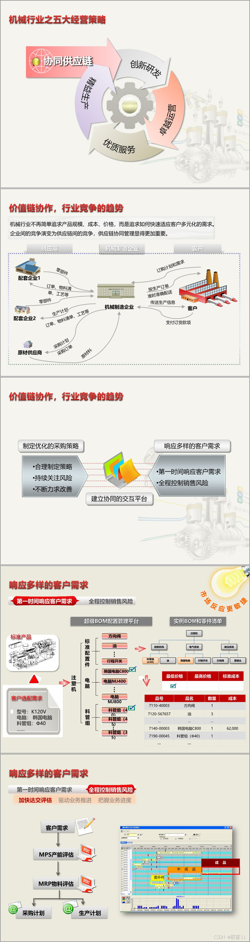 供应链协同方面,企业间竞争已演变为供应链竞争。要制定优化采购策略(物料分类、计划模式等)、响应多样客户需求(快速响应、控制销售风险)、建立协同交互平台,以提升客户满意度、降低采购成本、缩短响应时间。