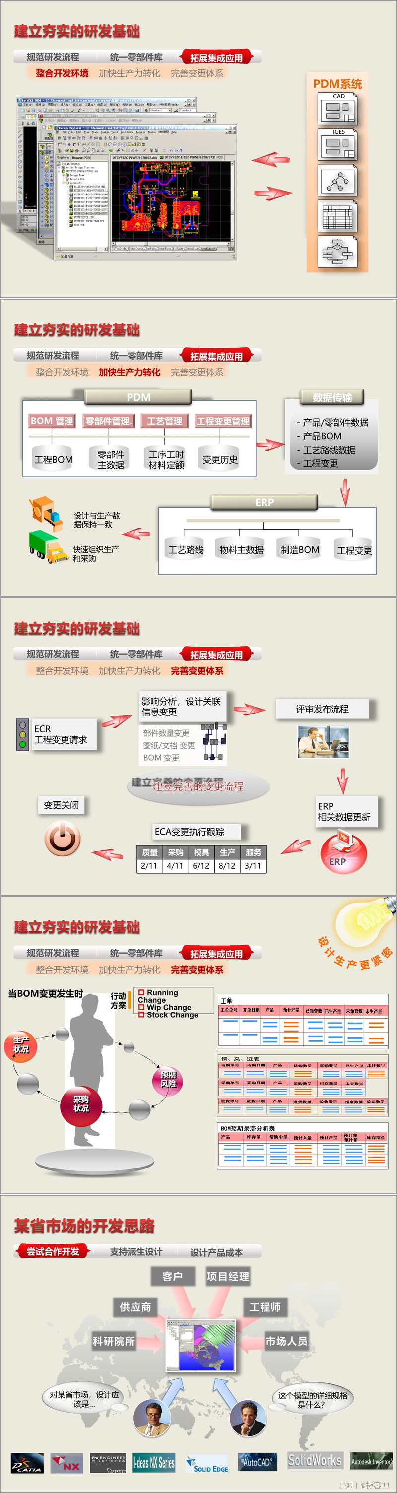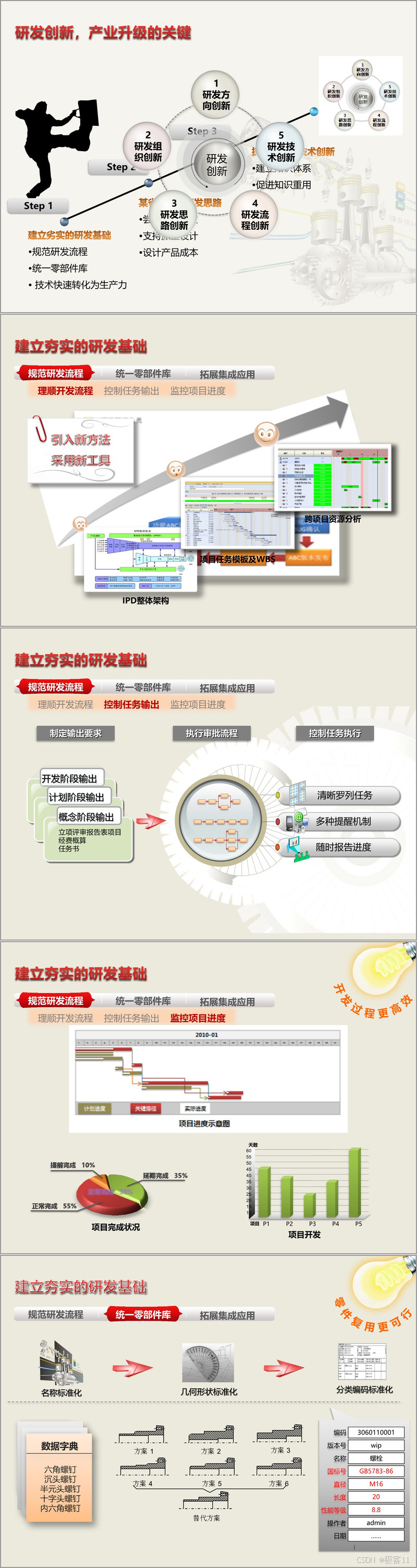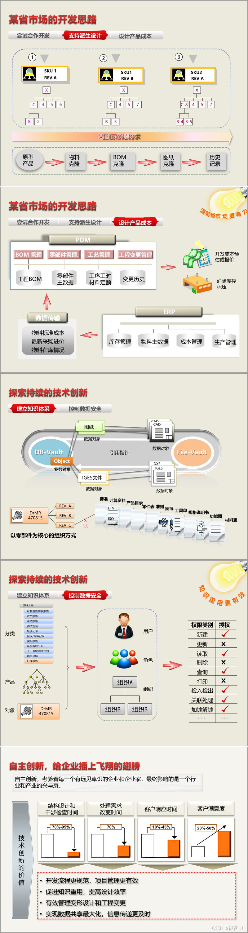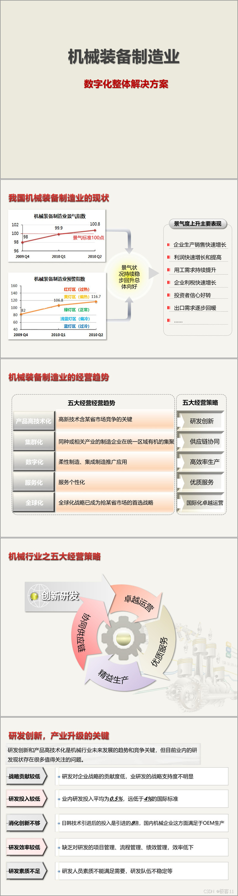 五大经营策略包括研发创新、供应链协同、高效率生产、优质服务和国际化卓越运营。其中,研发创新是产业升级的关键,但目前存在研发投入低(业内平均 0.5%,远低于国际 4% 标准)、消化创新不足、战略贡献低、效率低、研发人员素质不足等问题。为此,需从建立夯实的研发基础(规范流程、统一零部件库、技术转化)、某省市场开发思路(合作开发、派生设计、成本设计)、探索持续技术创新(建立知识体系、知识重用)等方面改进,还可从研发方向、组织、思路、流程、技术五个维度进行创新。
