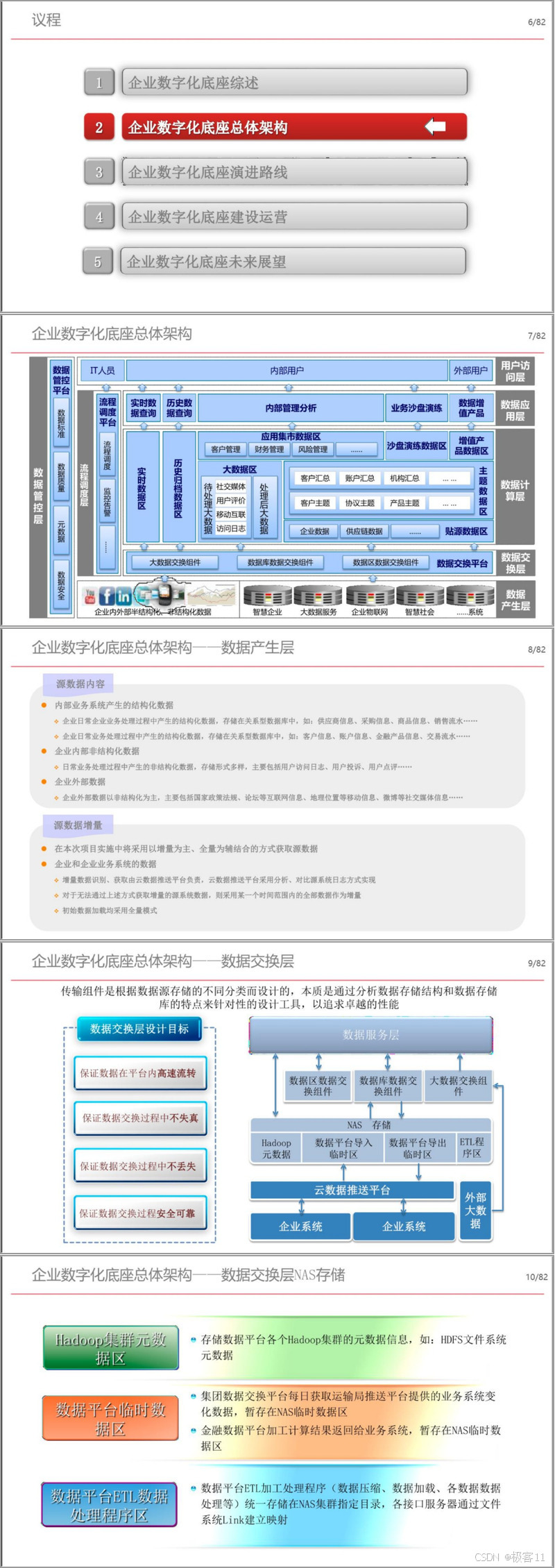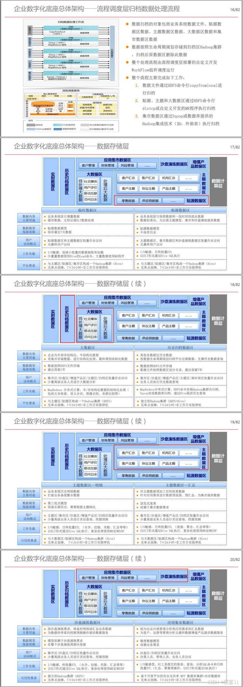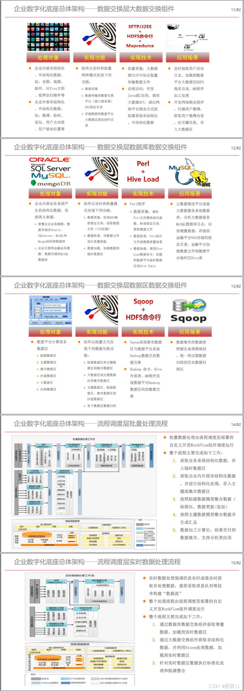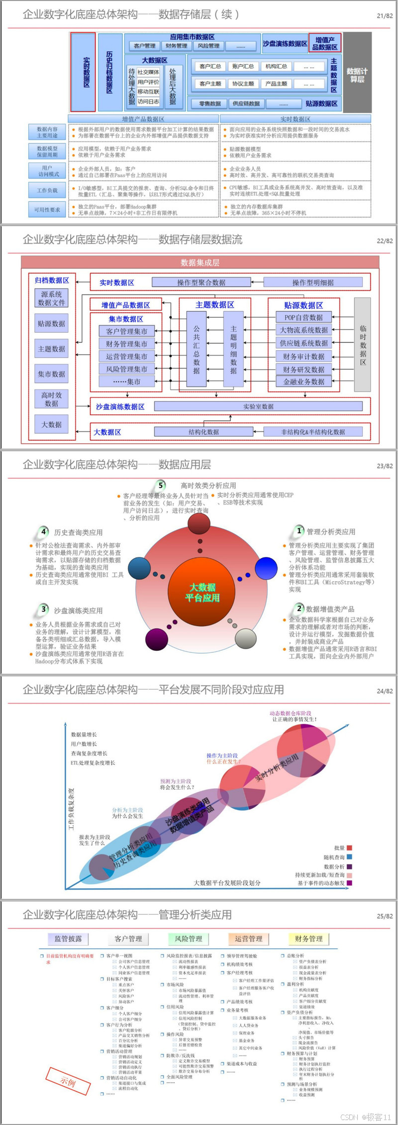 总体架构方面,数据产生层涵盖内部结构化、非结构化数据及外部数据,采用增量为主、全量为辅的方式获取。数据交换层设计传输组件,确保数据高速、准确、安全流转,包含多种组件和存储区域。流程调度层有批量、实时和归档数据处理流程,分别处理不同数据需求。数据存储层包含多个数据区,各有特定数据内容、用途等,且存在明确数据流。数据应用层有管理分析、沙盘演练等五类应用,对应平台发展不同阶段。数据访问层提供多种展现形式满足不同用户需求。数据管控体系通过组织架构等四域相互作用实现管控,包含组织、标准等多方面管理,以及高阶工作流程和管控平台。总体产品框架整合多种平台和工具。