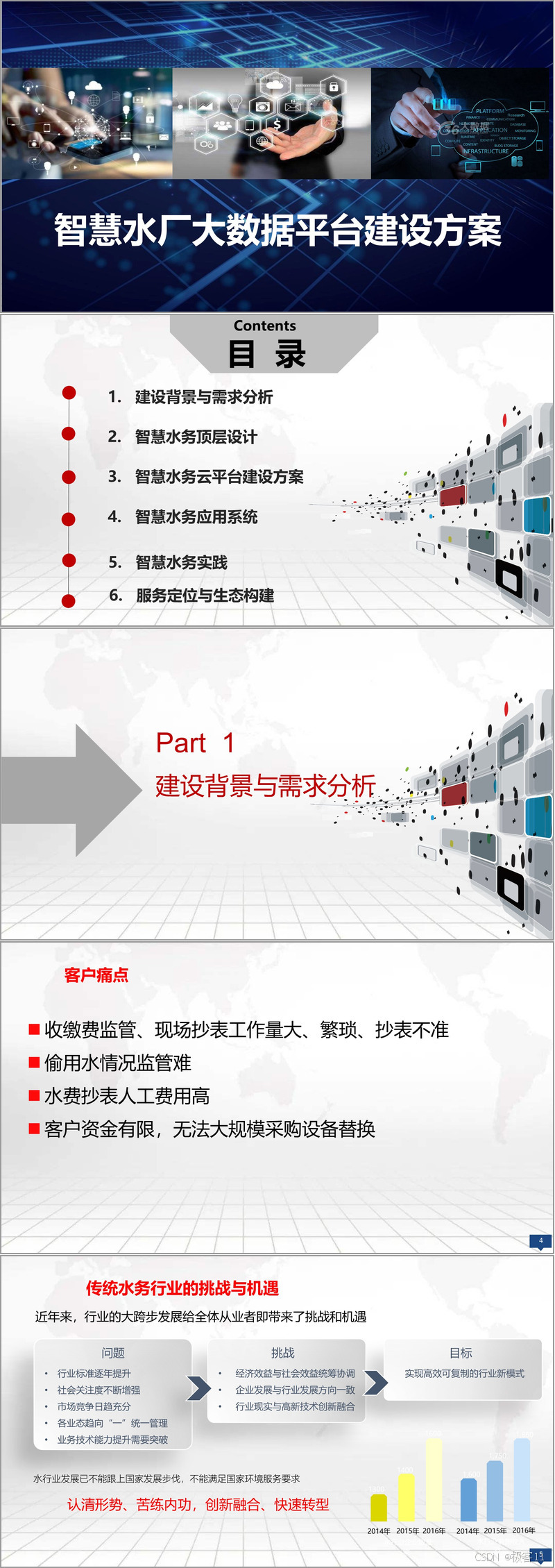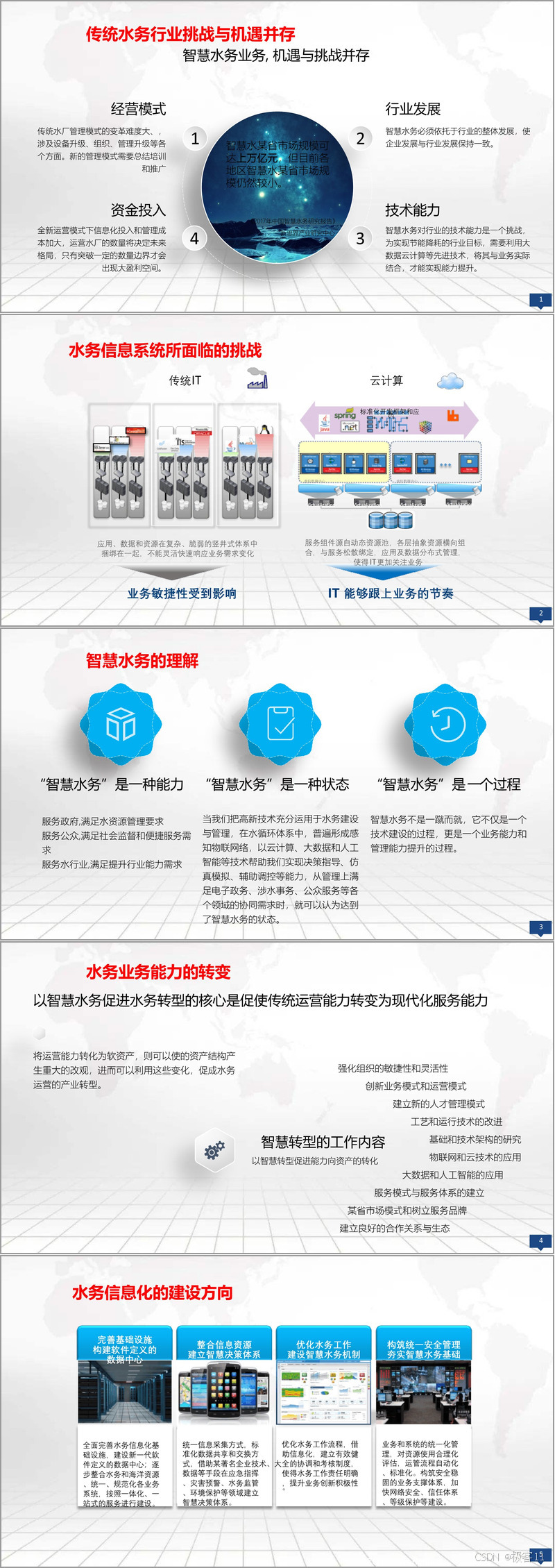 在此基础上,方案提出了对“智慧水务”的深刻理解:它不仅是一种通过运用物联网、云计算、大数据、人工智能等高新技术实现更透彻感知、更全面互联、更智能决策和更高效协同的能力与状态,更是一个涉及技术升级、管理优化和业务能力提升的持续演进过程。其核心目标是推动水务业务能力从传统的运营模式向现代化服务能力转变,将运营能力转化为宝贵的软资产,进而促进产业转型。