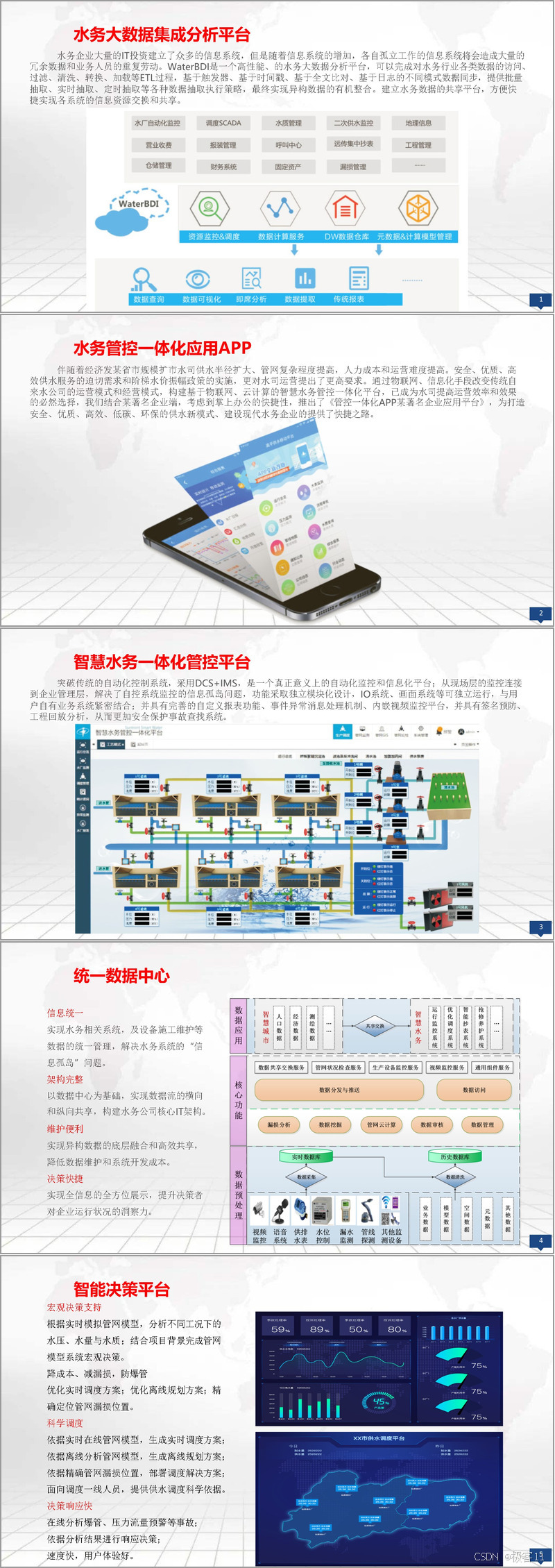 方案的顶层设计部分勾勒出了智慧水务大数据云平台的总体架构。该架构以“数据+地图+业务”为理念,旨在构建一个整合智慧生产运维、智慧管网调度、智慧客服营销、智慧计量以及智慧管控决策五大核心应用的综合性平台。其设计遵循“顶层设计、统一标准、资源整合、系统集成、共建共享、分级维护”原则,致力于实现水务一体化管理(“水务一”),提升核心数据库利用率,并对管网压力、流量、水质、二次供水、DMA分区等实现全过程监管与决策分析,最终以信息化驱动管理精细化。