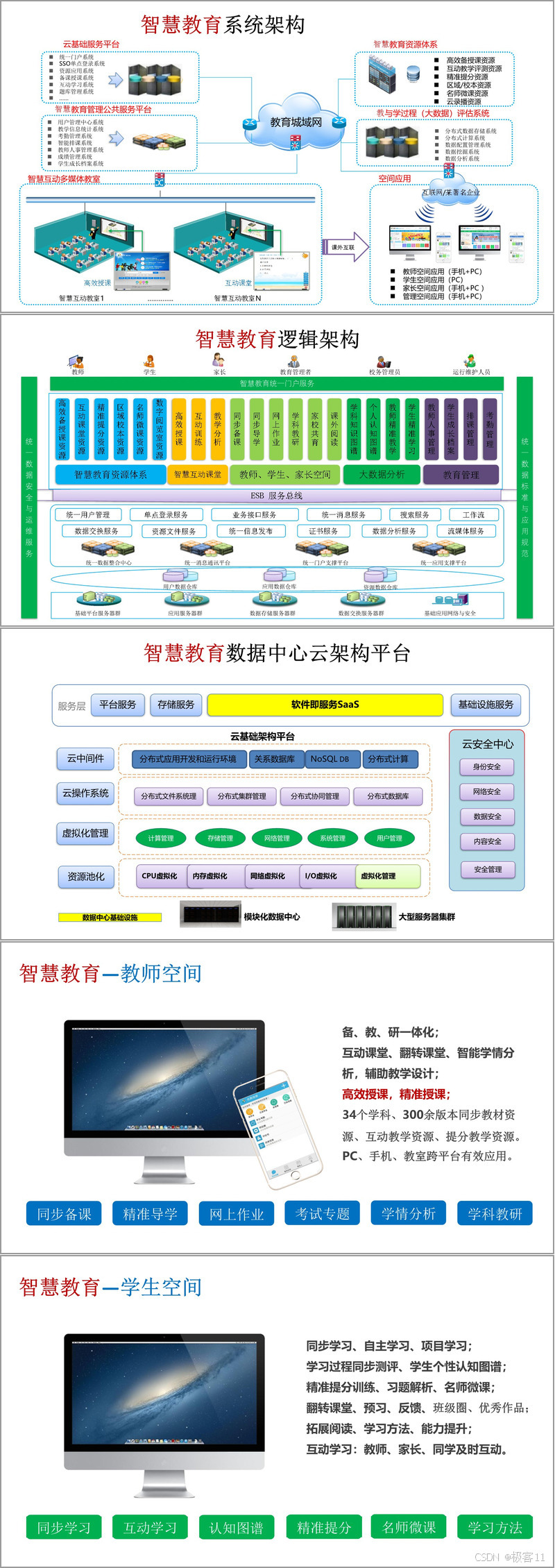 智慧教育体系通过技术融合的学习环境构建,使教师能够实施高成效教学方法,同时为学习者提供个性化服务与发展体验。其系统架构采用分层设计:底层为云基础服务平台,承担数据存储与计算支持;中间层构建智慧教育资源体系,涵盖34个学科、300余版本教材资源,容量近7T;上层则通过教师空间、学生空间、家长空间与管理空间形成完整应用生态。数据中心采用云架构平台,实现教育数据的统一采集、分析与应用。