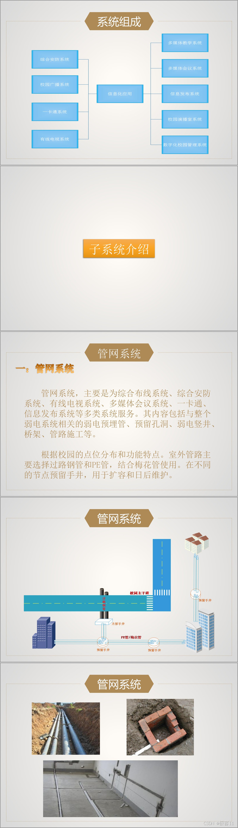 管网系统:作为所有系统的“地下生命线”,其设计考虑了点位分布与功能需求,室外采用过路钢管、PE管和梅花管组合方案,并预留手井以便于未来扩容与维护,体现了前瞻性。