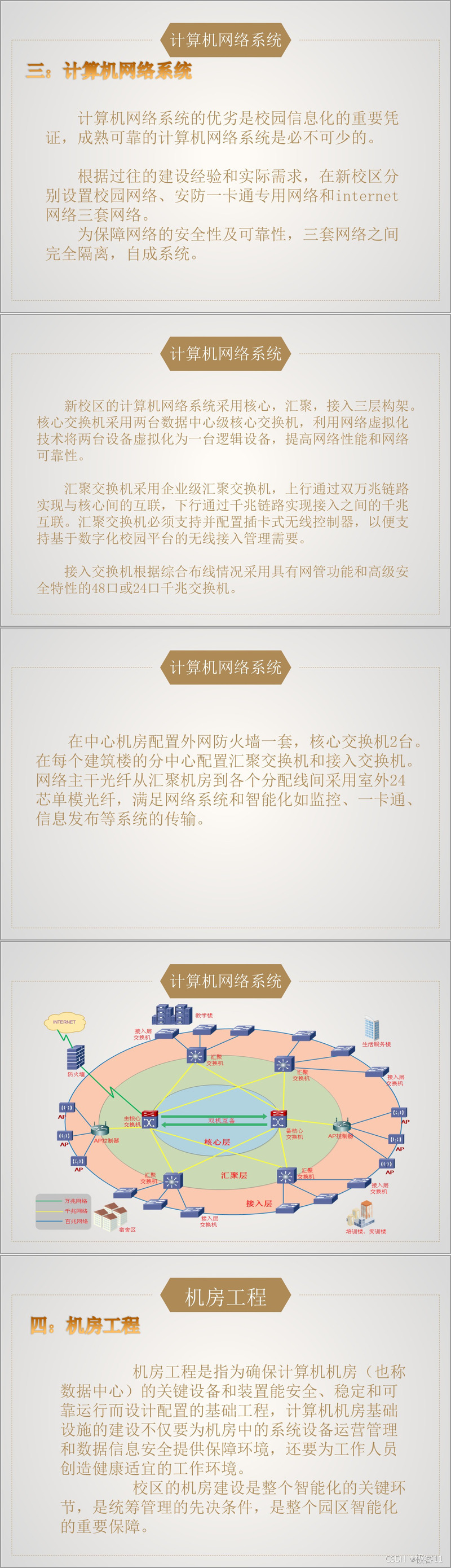 计算机网络系统:为确保安全与性能,创新性地规划了三套物理隔离的网络:校园网、安防一卡通专网和互联网。网络架构采用核心-汇聚-接入三层模式,通过设备虚拟化、链路冗余等技术保障高可靠性。无线网络管理功能也集成在汇聚层,支持未来的无线校园扩展。