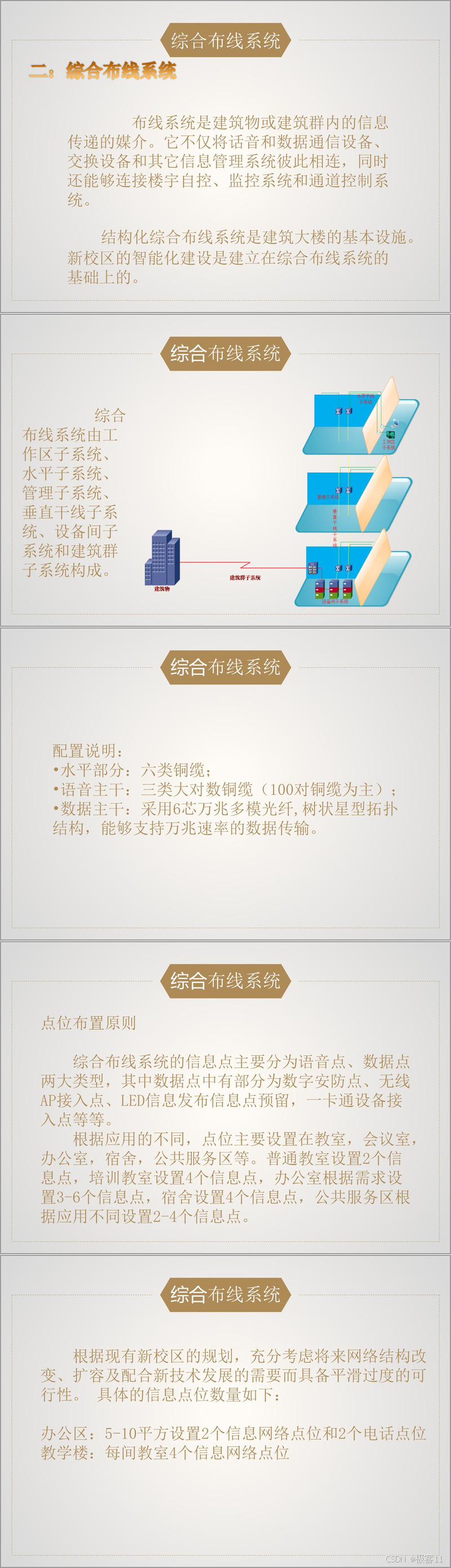 综合布线系统:采用成熟的六类铜缆到桌面、万兆多模光纤作数据主干、三类大对数铜缆作语音主干的星型拓扑结构。信息点位规划细致,针对教室、办公室、宿舍、公共服务区等不同场景设置了差异化的点位数量,为各类应用接入打下灵活基础。