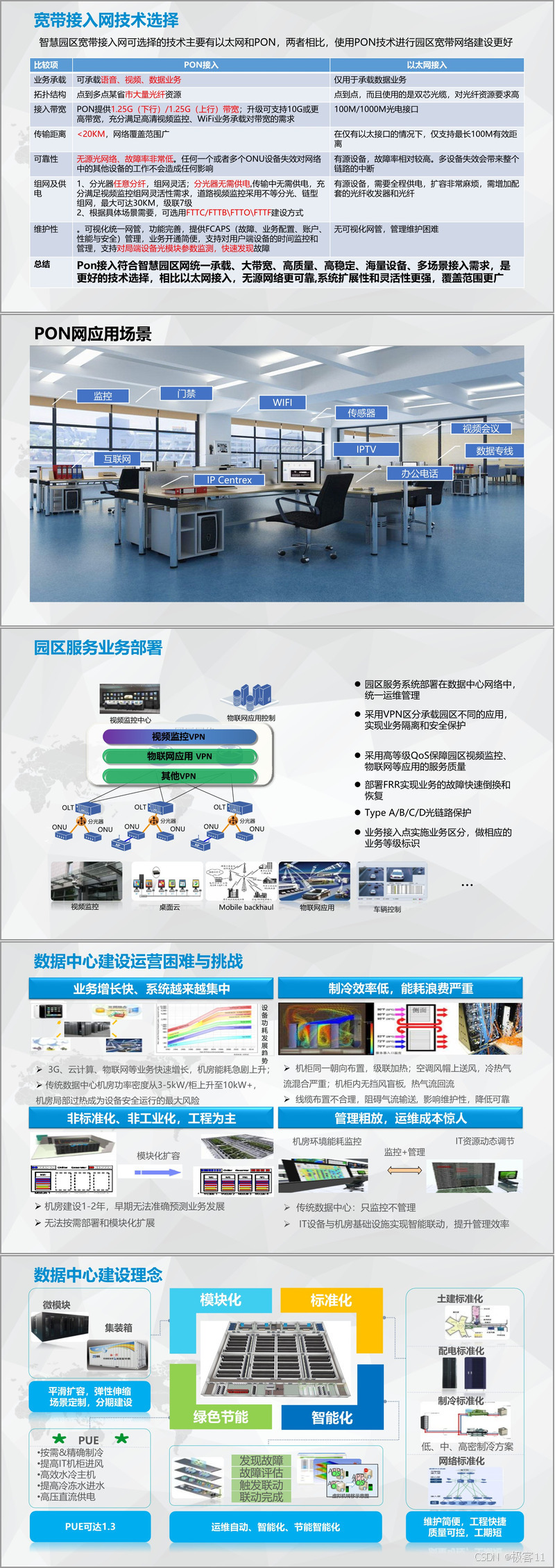 数据中心是园区智慧化运营的“心脏”。面对业务快速增长带来的能耗压力与运维复杂性,方案提出以“模块化、标准化、智能化”为核心的建设理念。通过微模块设计整合电气、制冷、管理等系统,实现快速部署与弹性扩容。在绿色节能方面,采用密闭通道、列间空调、自然冷却等先进技术,可将PUE(电源使用效率)控制在1.4以下,显著降低运营成本。