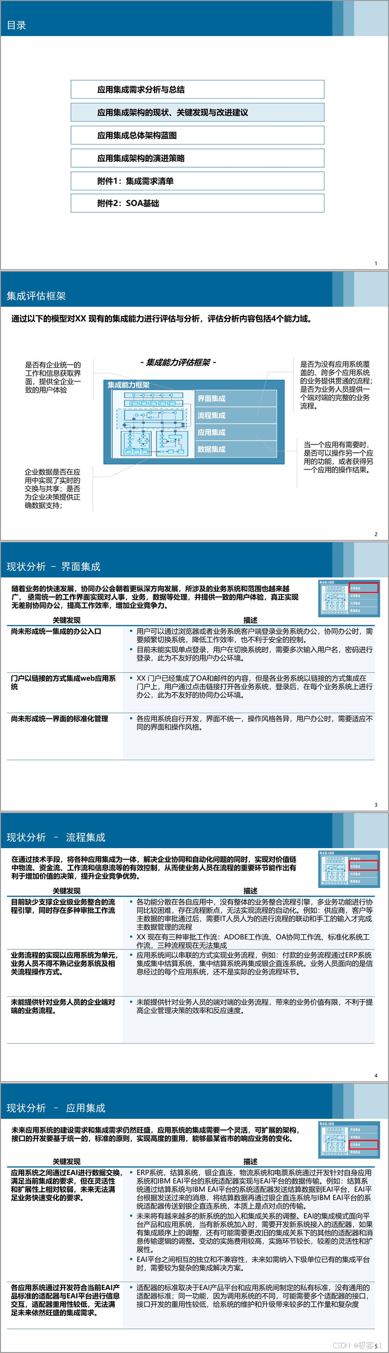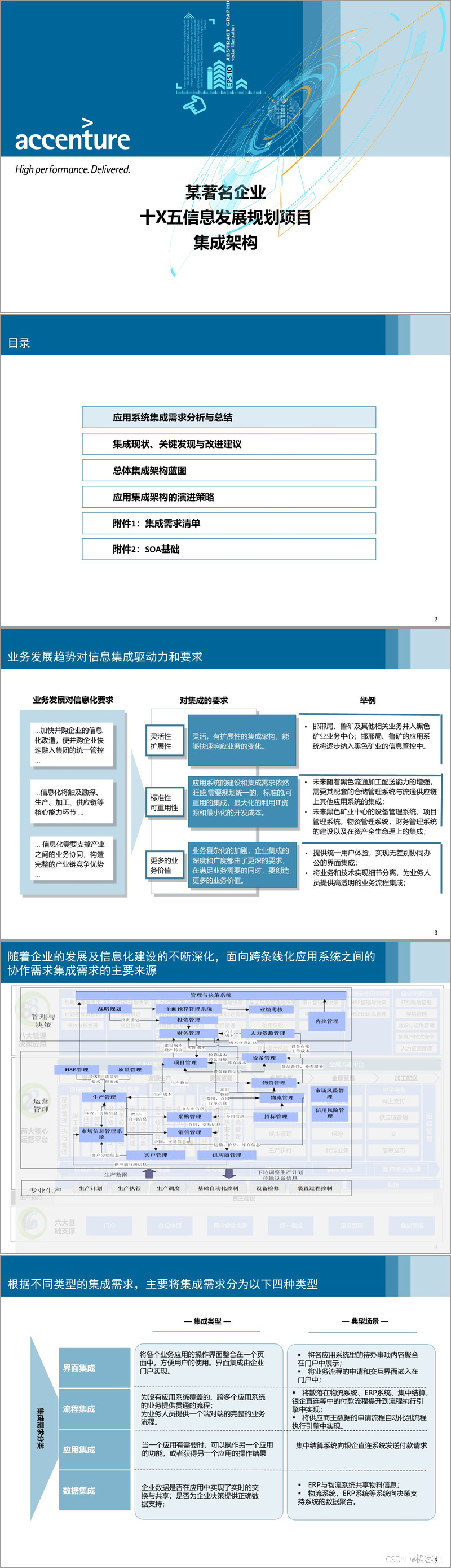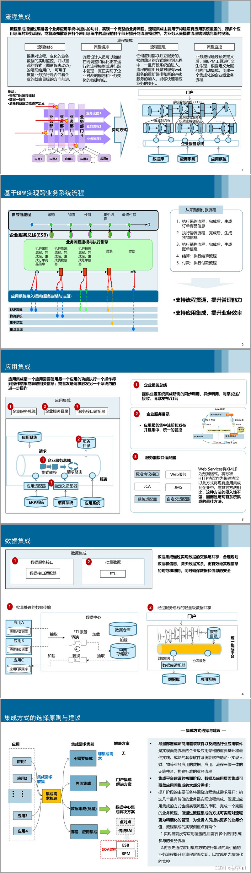 本规划方案为企业信息化发展描绘了一幅清晰的集成架构蓝图,旨在构建一个灵活、标准、可重用的集成体系,以快速响应业务变化,支撑集团统一管控与产业链协同。方案首先深入分析了业务发展趋势对信息化的驱动力,指出随着企业并购加速、核心业务环节信息化深入以及产业链协同需求增强,集成架构必须具备高度的灵活性、扩展性和标准性。