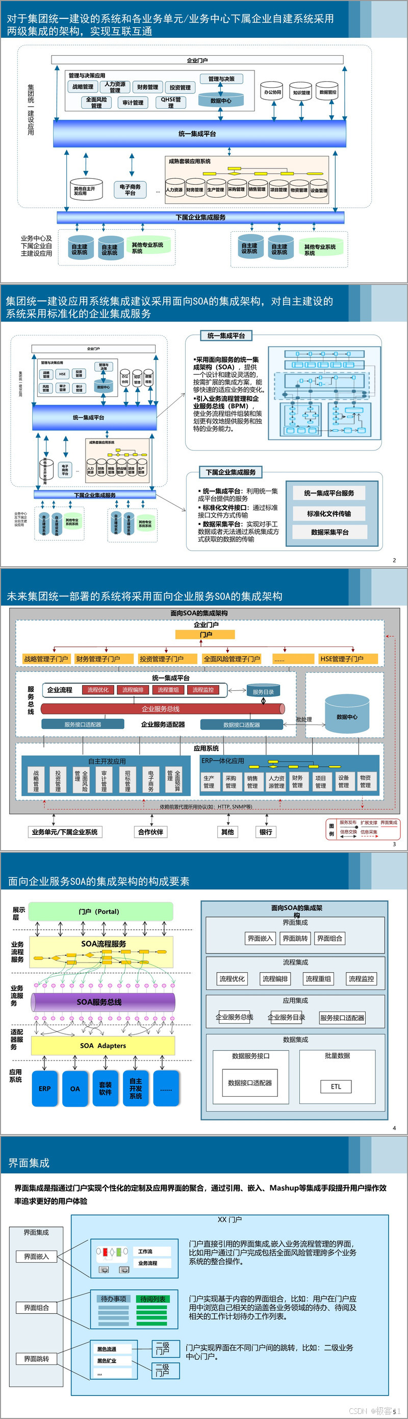 总体集成架构蓝图采用两级集成策略:集团统一建设系统采用面向SOA的集成架构,各业务单元自建系统则通过标准化企业集成服务实现互联互通。架构核心要素包括企业服务总线(ESB)、服务目录、流程引擎等,通过服务编排实现跨系统业务流程整合。界面集成由企业门户实现操作界面聚合;流程集成通过BPM引擎贯通跨系统业务流程;应用集成以标准化服务接口支持系统间功能调用;数据集成则通过批量传输或服务总线实现数据共享与一致性管理。