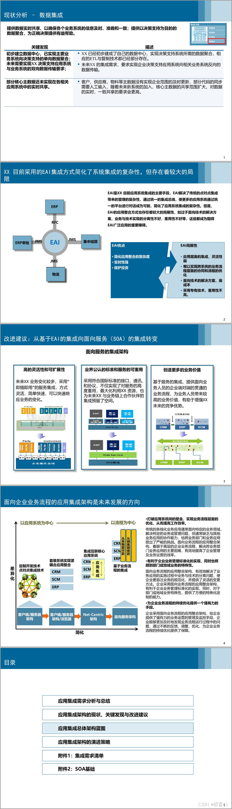 方案关键发现指出,现有EAI集成方式在灵活性和扩展性上存在局限,未来无法满足业务快速变化的要求。因此,改进建议明确提出从基于EAI的集成向面向服务(SOA)的集成架构转变。SOA架构以业界公认的标准为基础,具备高灵活性和可扩展性,支持服务的可重用,能快速响应业务变化,并为业务人员提供端到端的业务流程视角,创造更多业务价值。