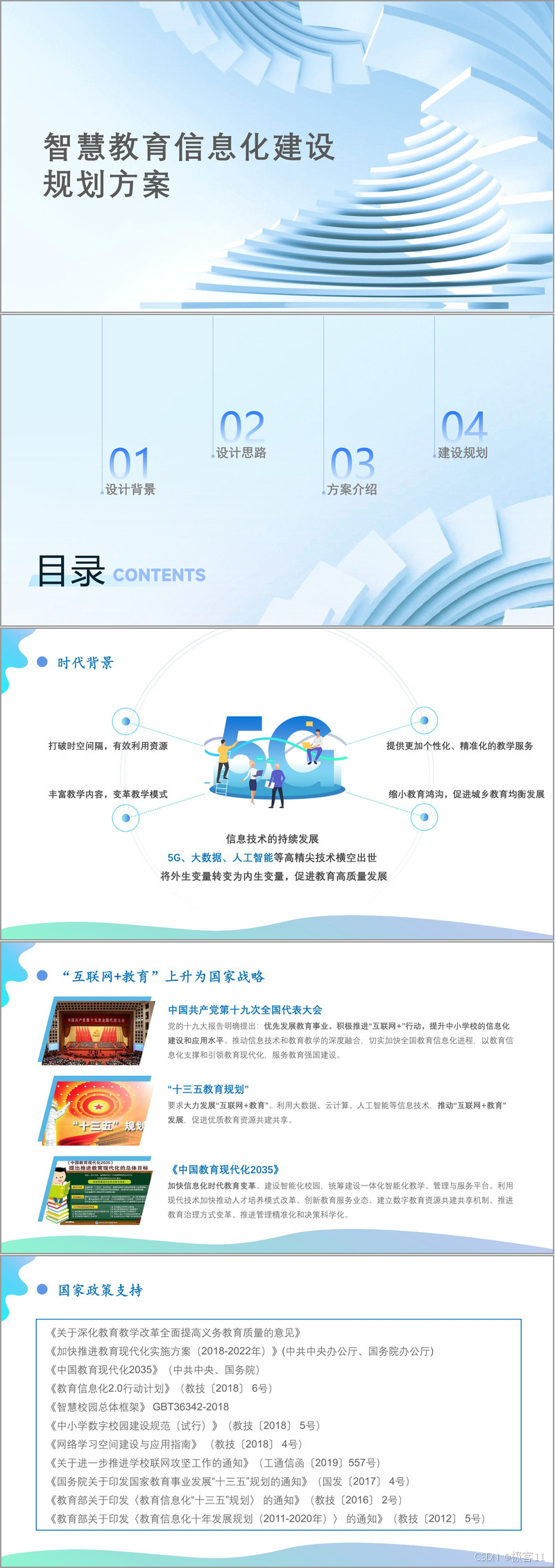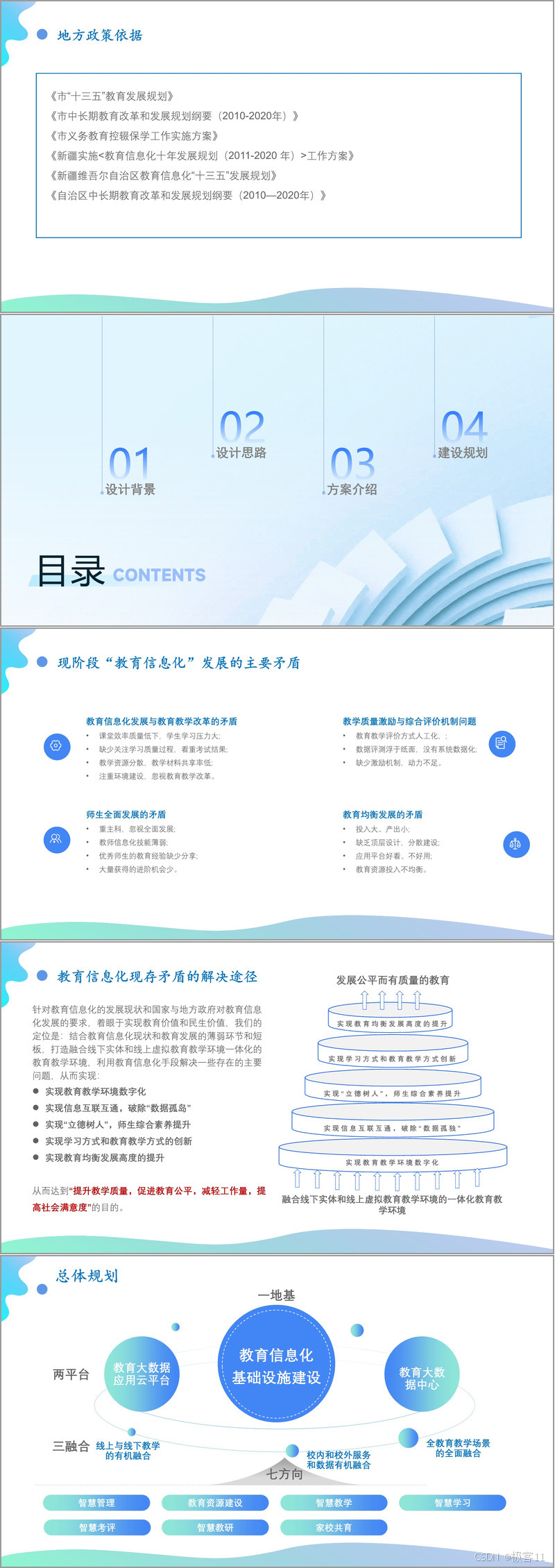 方案首先深入分析了教育信息化发展的时代背景与政策依据。党的十九大报告、“十三五”教育规划及《中国教育现代化2035》等国家战略均明确要求推动信息技术与教育教学的深度融合。方案指出,当前教育信息化面临四大矛盾:教育信息化与教学改革的脱节、教学质量评价机制不健全、师生全面发展受限以及教育投入产出不均衡。针对这些问题,方案提出通过建设“互联网+教育”大平台,实现教育教学环境数字化、信息互联互通、师生素养提升及教育均衡发展。