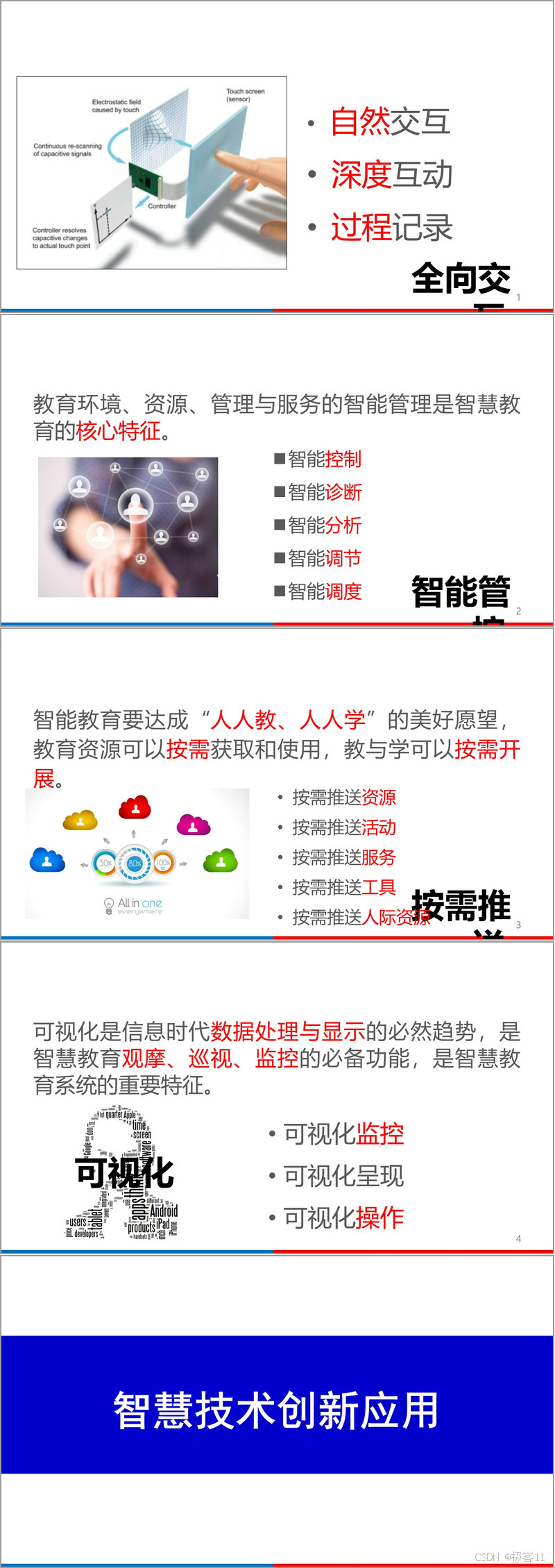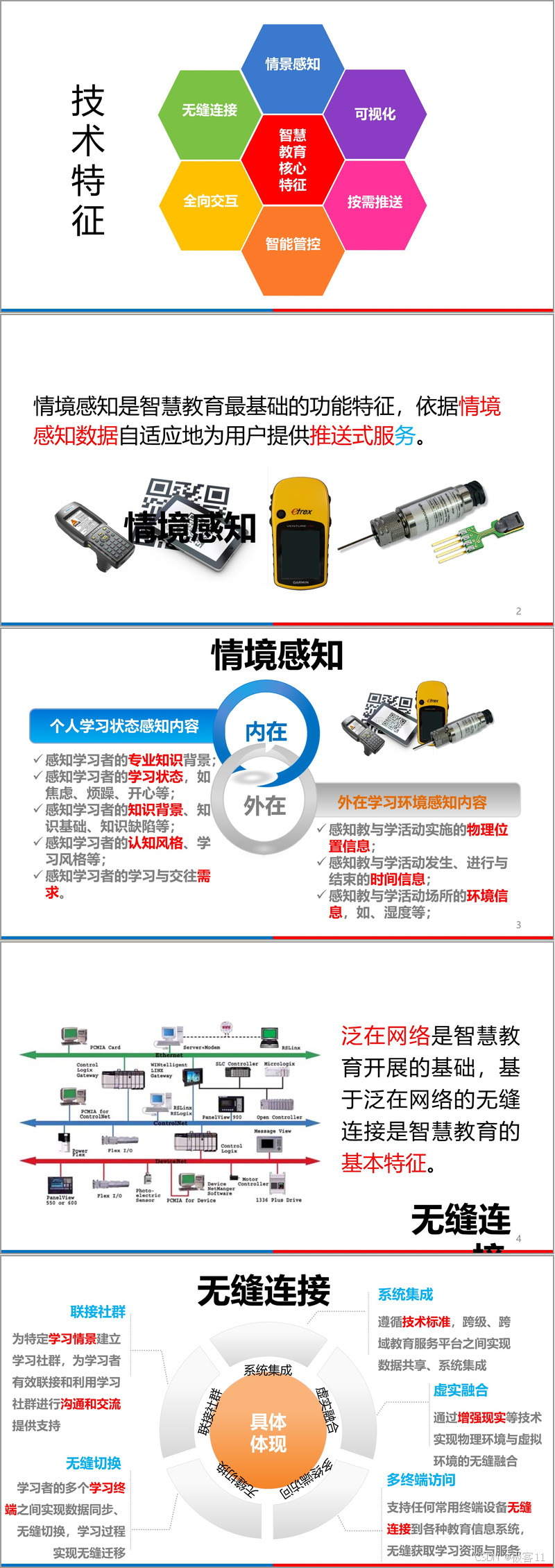 智慧教育具有六大核心特征:情境感知、无缝连接、全向交互、智能管控、按需推送和可视化。其中,情境感知是基础功能,通过感知学习者的知识状态、情绪变化等内外在数据,提供自适应服务;无缝连接依托泛在网络,实现跨设备、跨平台、虚实融合的学习体验;智能管控则体现在对教育环境的智能诊断、分析与调节上。按需推送和可视化分别从资源服务和监控管理角度,支撑教育的精准化和透明化。