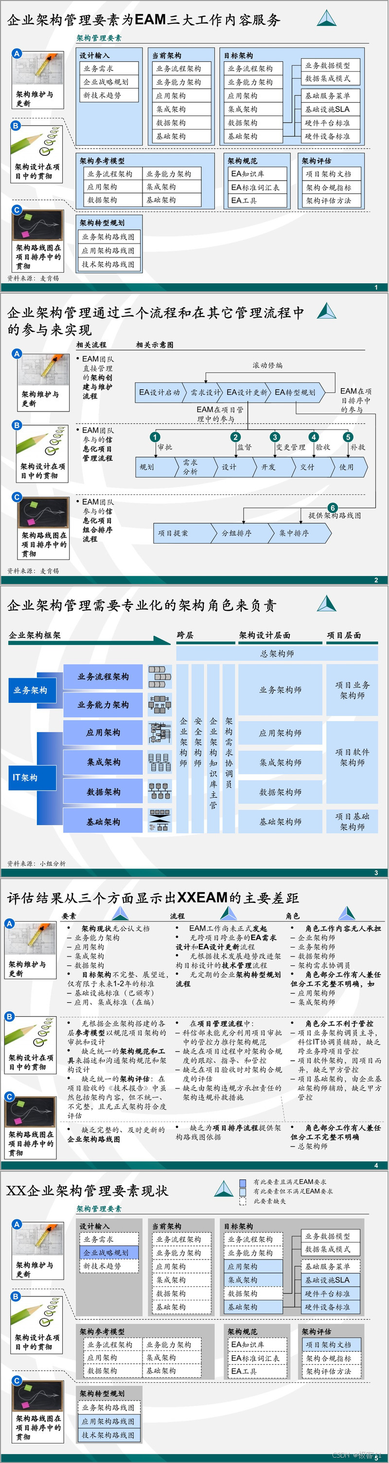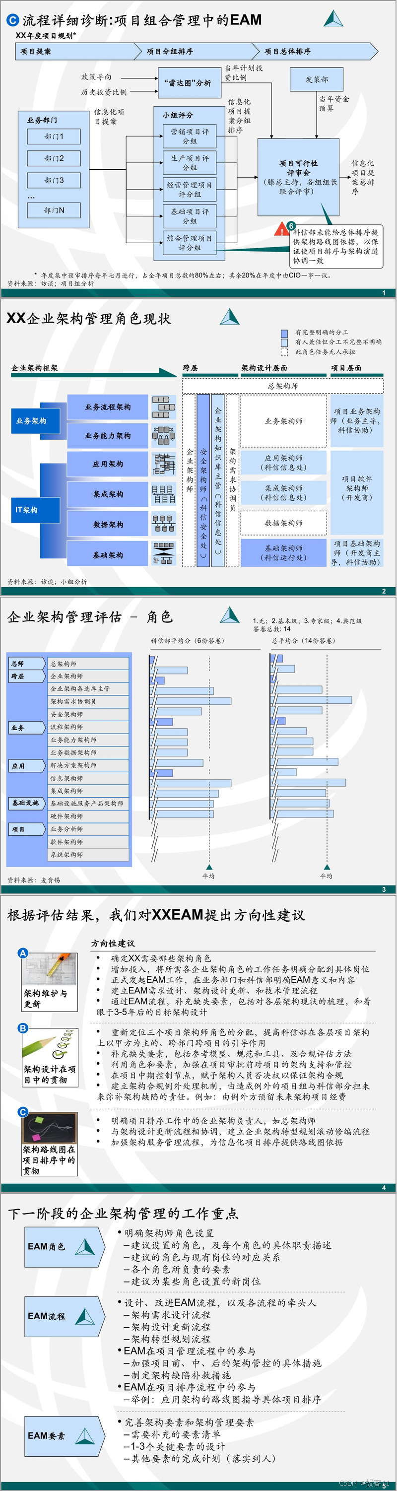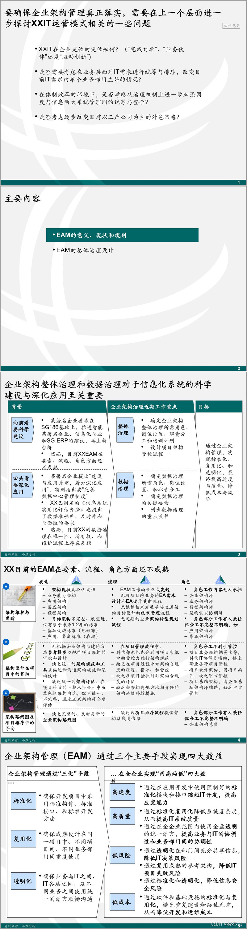 最后,方案将EAM的管理要素(如各类架构标准、参考模型、规划路线图等)明确分配到各个架构角色,形成了清晰的职责矩阵(RACI矩阵),确保了每一项工作都有明确的负责人(A)和参与者(R/C/I)。此外,还对项目组合排序如何与企业架构路线图相结合提出了原则性建议,并指出了为保障EAM有效运行,需要在更高层面的IT运营模式上探讨的议题,如IT在企业中的定位、IT需求统筹机制等。