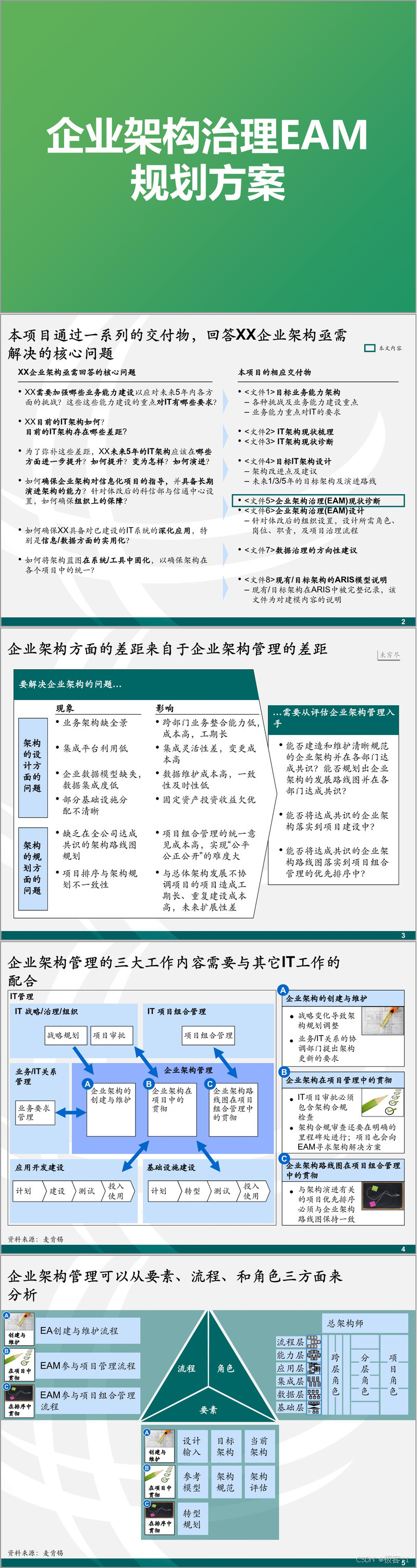 在总体治理设计部分,方案给出了极为详尽的实施蓝图。首先,在角色设计上,建议设置一个约23个全职当量的专业化EAM团队,涵盖了从战略决策层的企业架构总监,到协调各层IT架构的企业IT架构总监,再到具体的业务架构师、应用与集成架构师、数据架构师、安全架构师、基础架构师等专业角色,以及深入项目一线的项目业务架构师、项目软件架构师、项目基础架构师。方案对每个角色的概述、主要职责、汇报关系、业绩衡量指标及所需资质都进行了清晰描述。为确保角色能力,还提出了包含课堂讲座、实践学习、自学等多种形式的系统化培训计划。