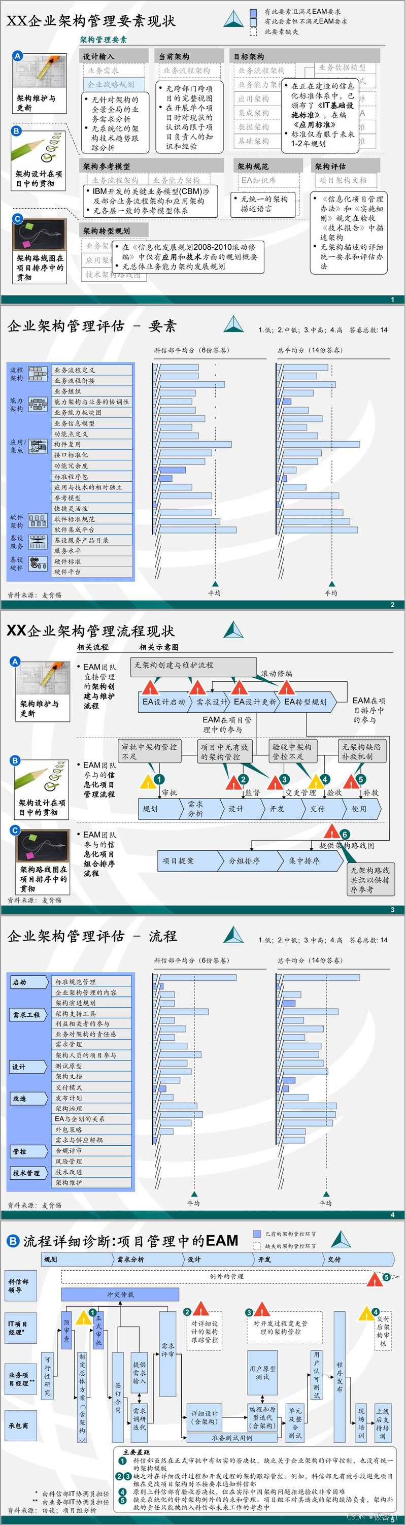 为扭转这一局面,方案提出了企业架构管理的宏伟目标,即通过标准化、复用化、透明化的管理手段,最终在全企业范围内实现“两高两低”的四大效益:高速度(快速响应变化)、高质量(提升系统稳定性)、低成本(减少重复建设与运维开销)和低风险(降低决策与安全风险)。一个成熟的EAM体系最终将通过类似“架构仪表板”的可视化方式,清晰展示架构健康度与管理效益。