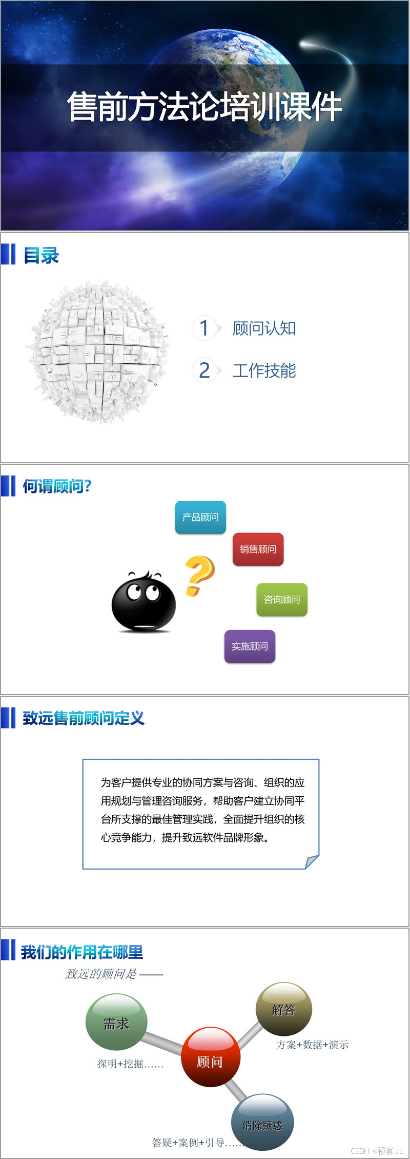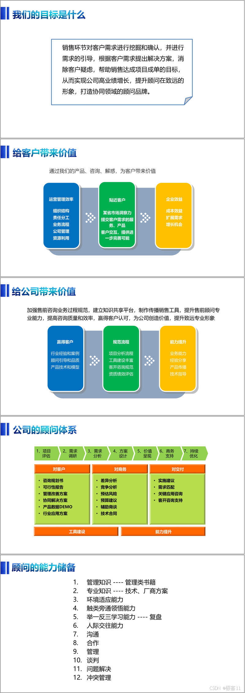 本文件作为大型企业售前顾问专项培训课件,构建了覆盖顾问认知与核心工作技能的完整方法论体系,为售前顾问提供从客户需求挖掘到项目成交的全流程工作指南,兼具理论指导性与实践操作性。