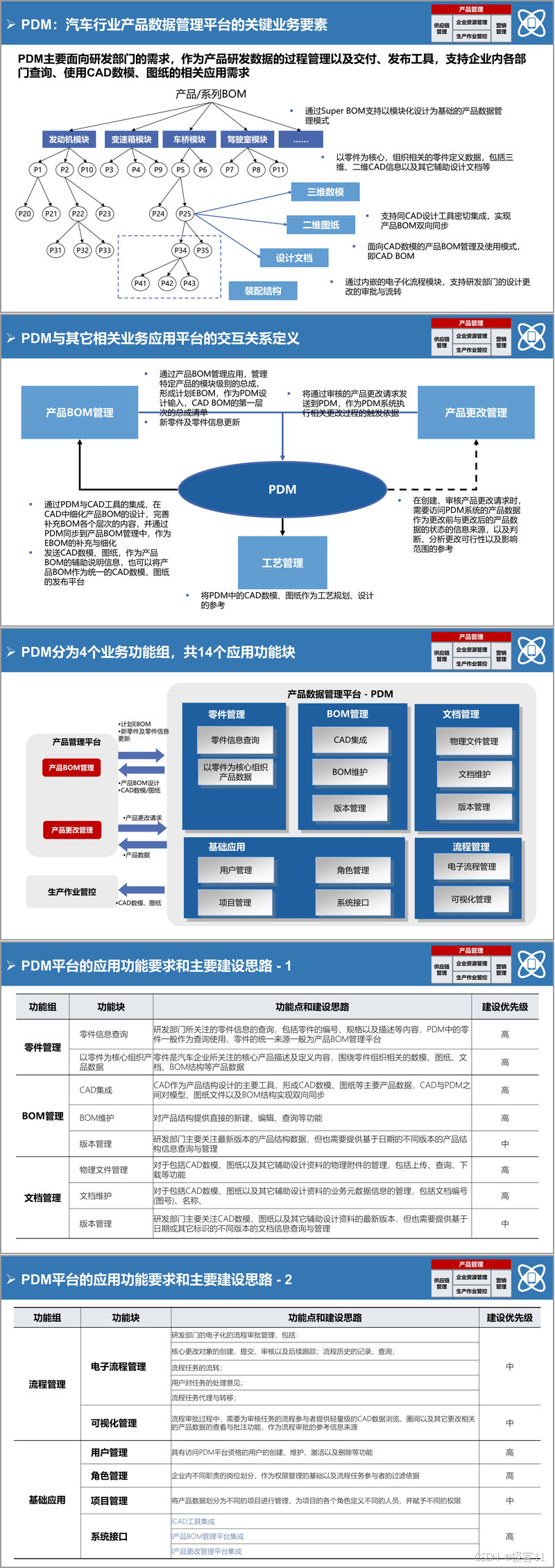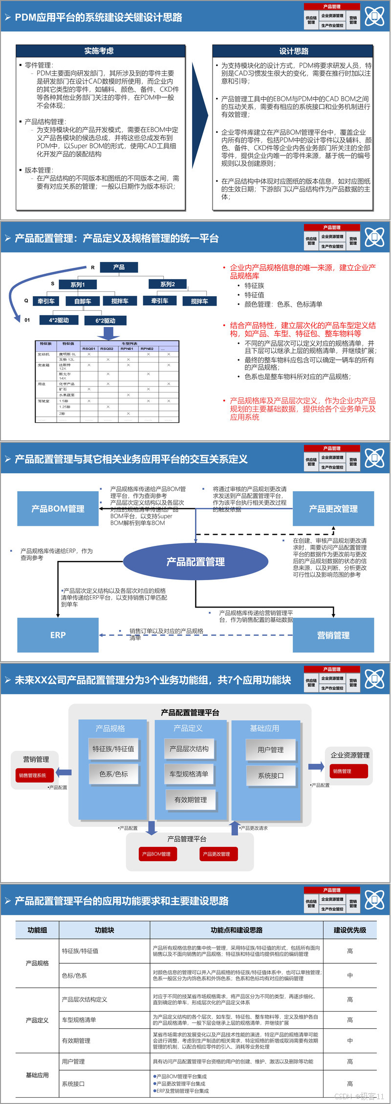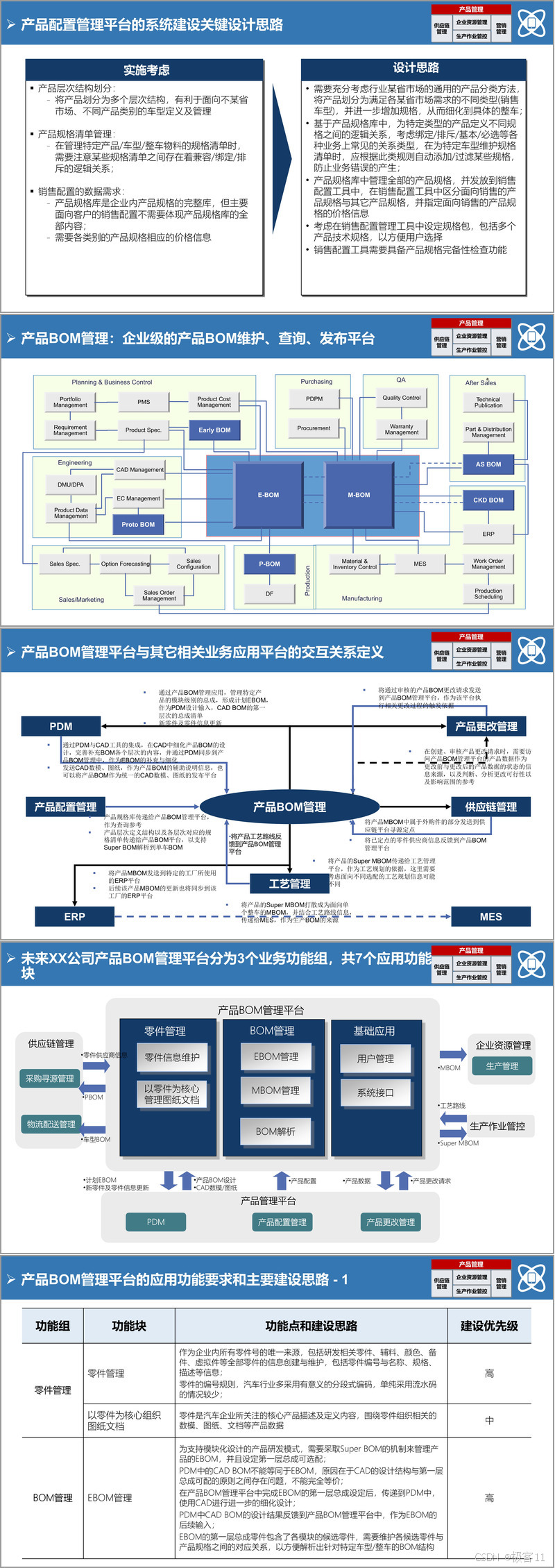 应用架构设计是方案的核心,构建了五大核心业务平台与多个支撑系统。产品管理平台以 PDM 为核心,整合产品配置管理、BOM 管理与产品更改管理,实现从 CAD 数模到 EBOM、MBOM 的全流程数据管控,支持模块化设计与跨部门协同;供应链管理平台涵盖采购寻源、供应商管理、物流配送三大子系统,实现从采购申请、定点管理到物流配送、库存管控的全链条协同;企业资源管理平台(ERP)聚焦生产、采购、库存、销售、财务等核心模块,实现财务业务一体化与集团化管控;生产作业管控平台介于 ERP 与自动化设备之间,提供生产监控、工艺规划、质量追溯等功能,支撑制造过程的精细化管理;营销管理平台则整合销售管理、呼叫中心、服务与备件管理,构建 “主机厂 - 经销商 - 客户” 的一站式服务体系。此外,方案还规划了 OA、企业门户、知识管理等战略支持系统,以及数据交换平台、数据仓库等决策分析系统,形成全方位的应用矩阵。