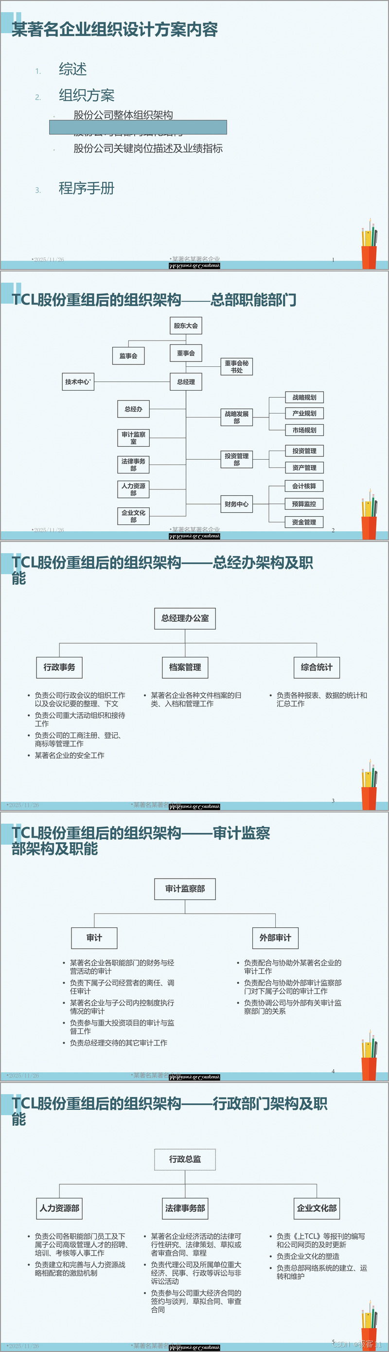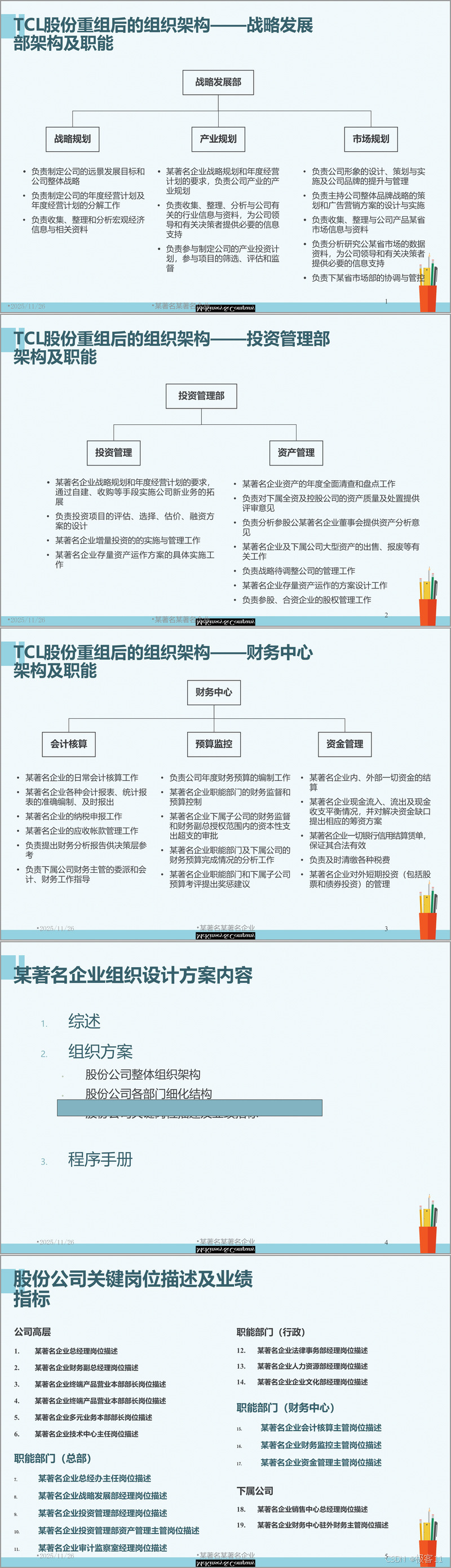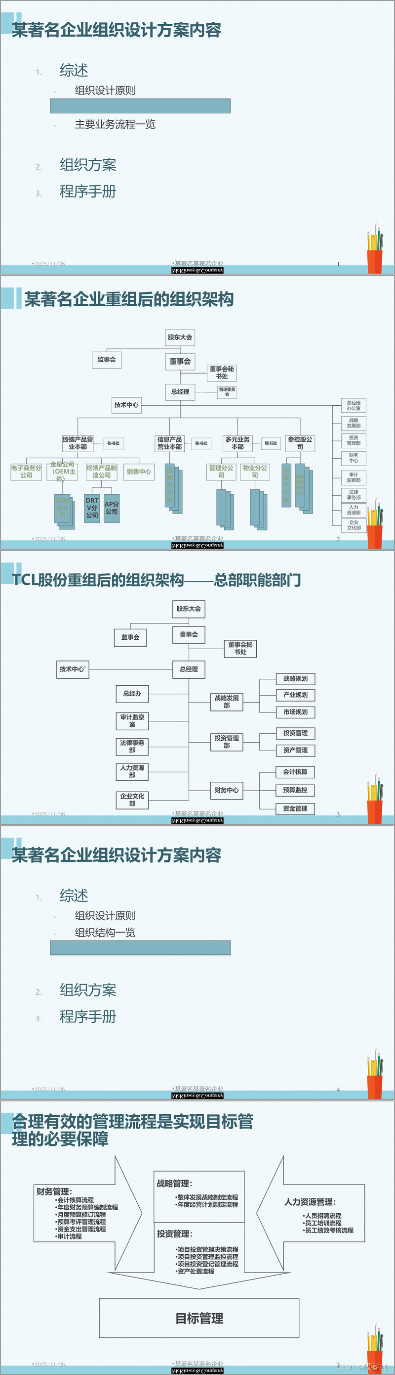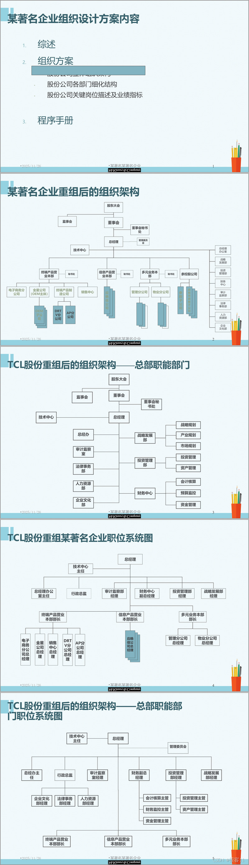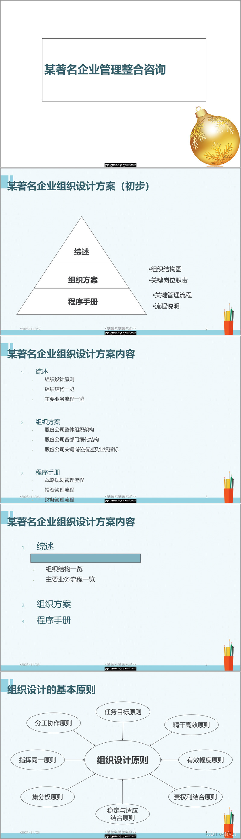 本方案是为某著名企业量身打造的管理整合咨询组织设计成果,涵盖综述、组织方案、程序手册三大核心板块,为企业重组后的规范化运营提供了全面框架。方案以科学的组织设计原则为指导,构建了清晰的组织架构、明确的岗位职责和高效的管理流程,旨在实现企业资源优化配置与战略目标落地。