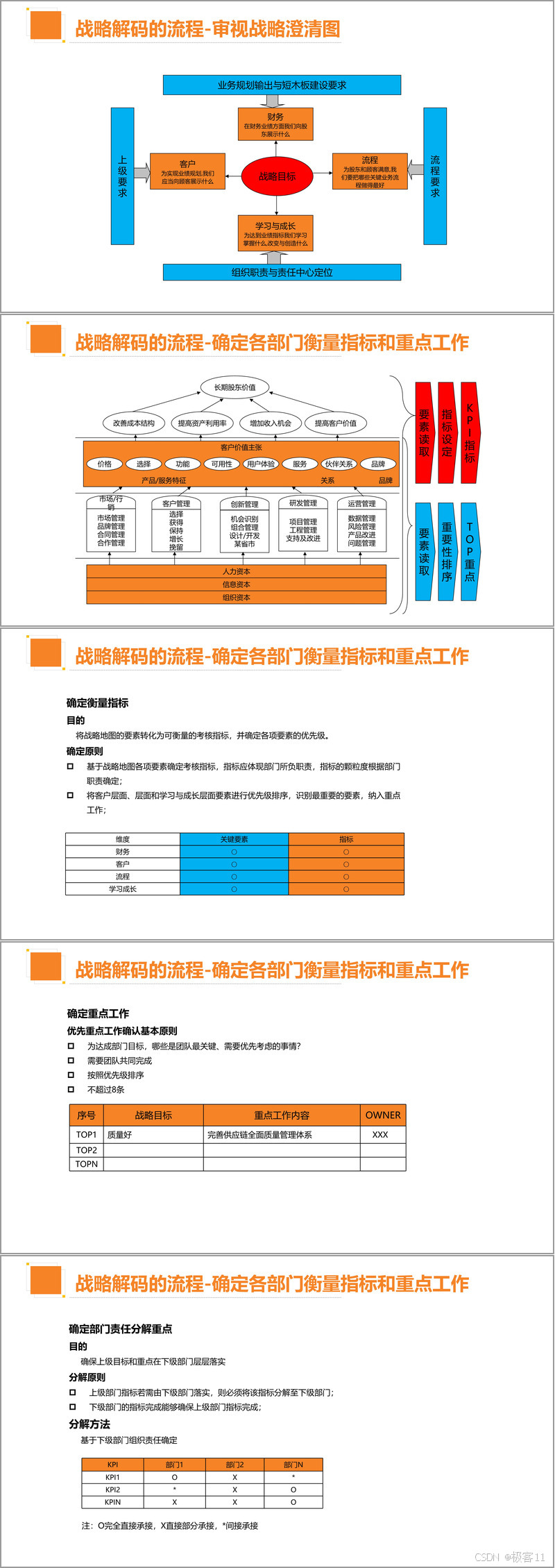 方案开篇明确绩效管理的三层进阶目标,从 1.0 的考核体系、2.0 的过程体系到 3.0 的绩效改善,强调绩效管理需与企业战略紧密衔接,解决指标分解不匹配、管理人员能力不足、制度机制不完善等核心问题。战略解码是体系基石,通过 “愿景使命 — 战略 — 战略地图 — 指标分解 — 个人目标” 的路径,将企业战略转化为可落地的绩效目标。采用平衡计分卡从财务、客户、流程、学习成长四个维度拆解战略,结合鱼骨图等工具识别关键成功因素,确保指标与战略重点高度契合。