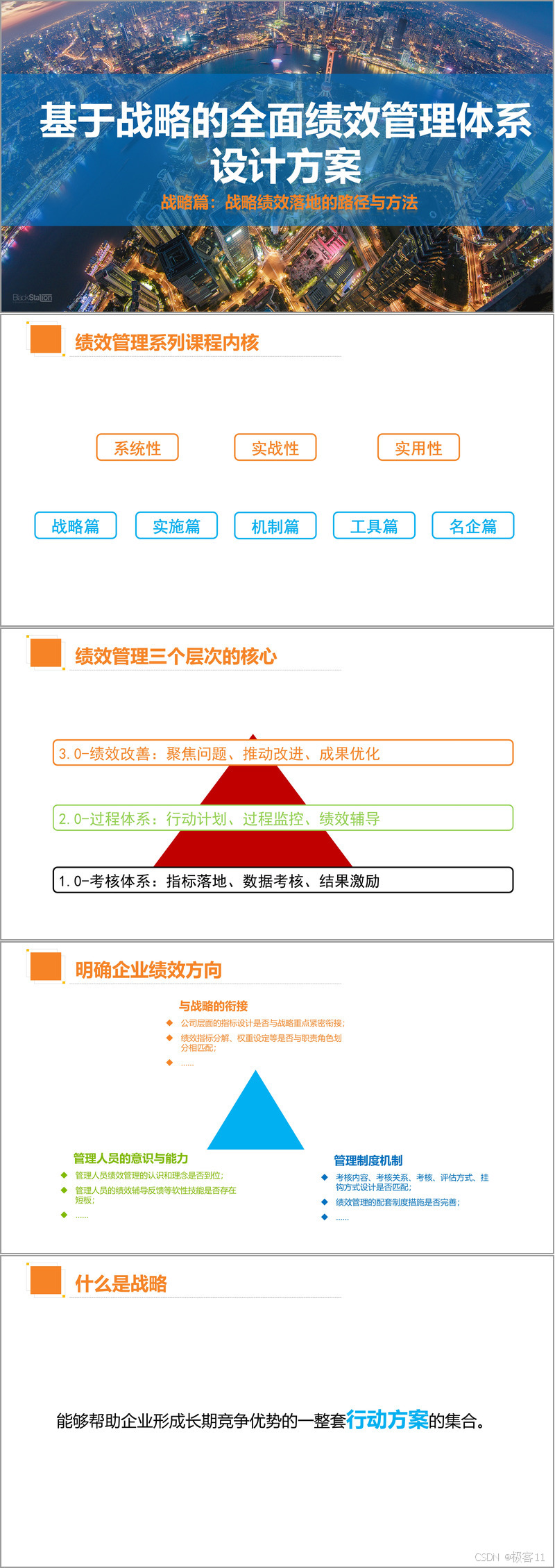 整个体系以战略为引领,以指标为核心,以制度为保障,以工具为支撑,以应用为目标,形成了 “战略解码 — 指标设计 — 过程管控 — 结果应用 — 持续改进” 的完整闭环,既保证了绩效管理的科学性与严谨性,又兼顾了企业实际操作的灵活性与可行性,能够有效推动企业战略落地、提升组织绩效与员工能力。