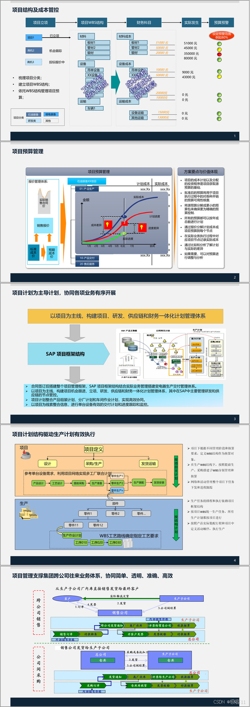 在整体架构设计上,方案构建了支撑层、运营层、决策管理层的多层次体系,覆盖项目管理、销售管理、生产管理、采购管理等九大核心模块。以项目管理为例,方案设计了基于 WBS 结构的成本管控模式,实现预算预警、成本归集与差异分析;销售管理模块则打造了从询价报价到回款服务的全流程数字化体系,支持灵活定价、分批交货与合同变更快速响应;生产管理通过 MRP 运行、滚动计划编制、条码追溯等功能,破解生产黑盒问题,实现精益化生产。