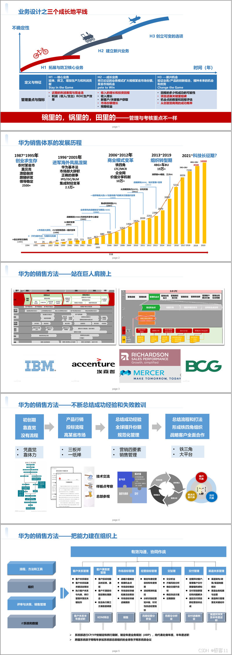 销售战略解码是组织能力建设的起点。文件指出,企业销售常面临共识缺失、信心不足、方法匮乏三大痛点,导致战略与执行脱节。华为通过 DSSTE 战略落地体系,将公司战略逐层分解为年度经营计划、组织 KPI 与个人 PBC 目标,形成 “战略 - 策略 - 执行 - 监控” 的闭环。依托 BLM 战略领导力模型,从市场洞察、战略意图、业务设计、创新焦点四大要素出发,结合 “五看” 分析法(看环境、行业、客户、竞争、机会),精准定位业务增长点,确保战略方向的正确性与可行性。同时,通过三大成长地平线理论,平衡核心业务、成长业务与新兴机会的资源分配,实现短期盈利与长期发展的有机统一。