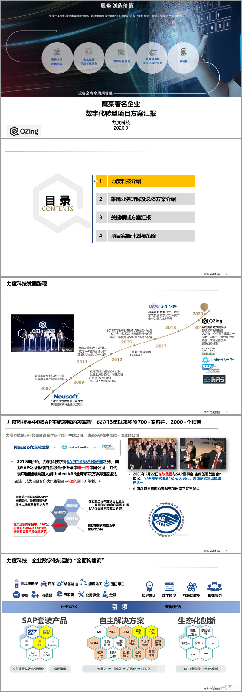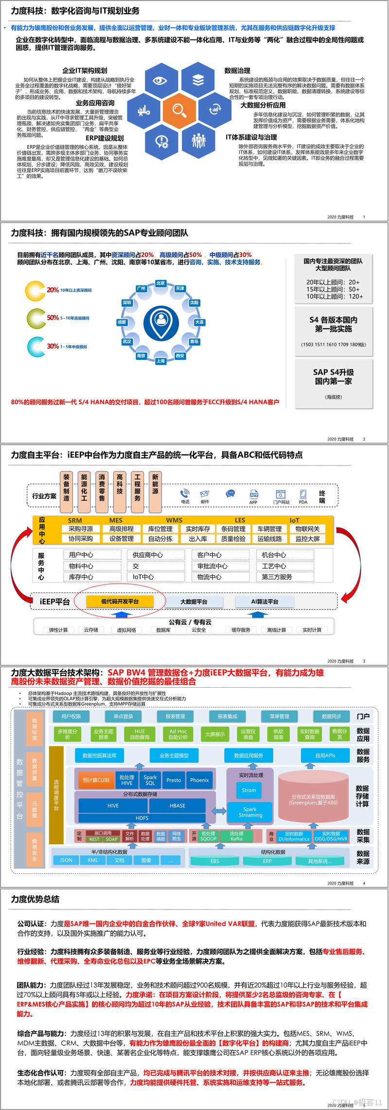 方案开篇对力度科技的专业能力进行了全面呈现。作为 SAP 中国唯一白金合作伙伴,力度科技拥有 13 年行业积淀,服务 700 余家客户、完成 2000 余个项目,组建了近千名专业顾问团队,其中资深顾问占比达 20%,核心成员具备 10 年以上 SAP 从业经验。依托自主研发的 iEEP 中台,结合 SAP S/4 HANA 等核心产品,形成了 “标准化 + 行业化 + 产品化” 的综合解决方案能力,可提供从顶层设计到落地执行的全流程服务,同时通过与腾讯云的战略协同,支持本地化与云部署等多种实施模式。
