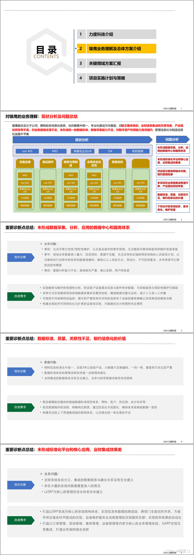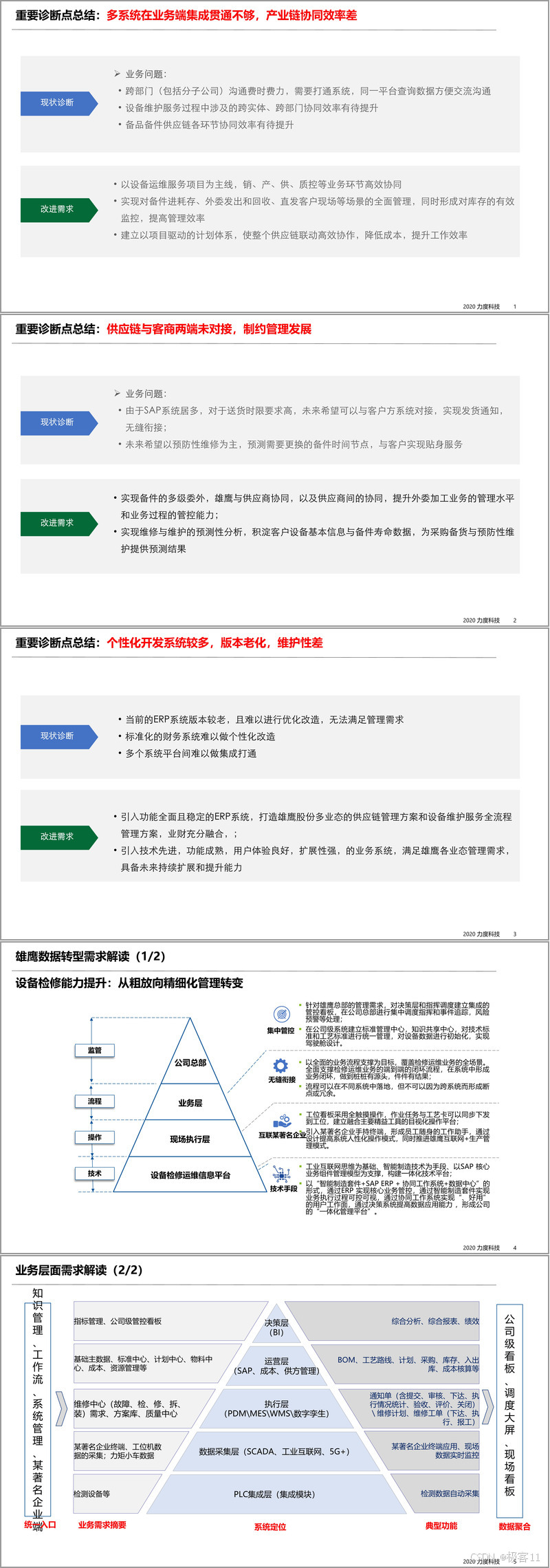 对再生资源集团的业务现状诊断是方案的核心前提。方案指出,企业当前存在多系统割裂、数据标准不统一、业财集成不足、产业链协同低效等突出问题。具体表现为个性化开发系统版本老化,物料编码冗余重复,供应链与客商端未实现有效对接,跨部门与分子公司沟通成本高,数据采集与分析能力薄弱,未能形成统一的数据资产利用体系。针对这些痛点,方案明确了 “一体化管理平台” 的建设目标,聚焦设备运维、备品配件、维修再制造、全寿命周期总包等核心业务,实现从粗放管理向精细化运营的转型。