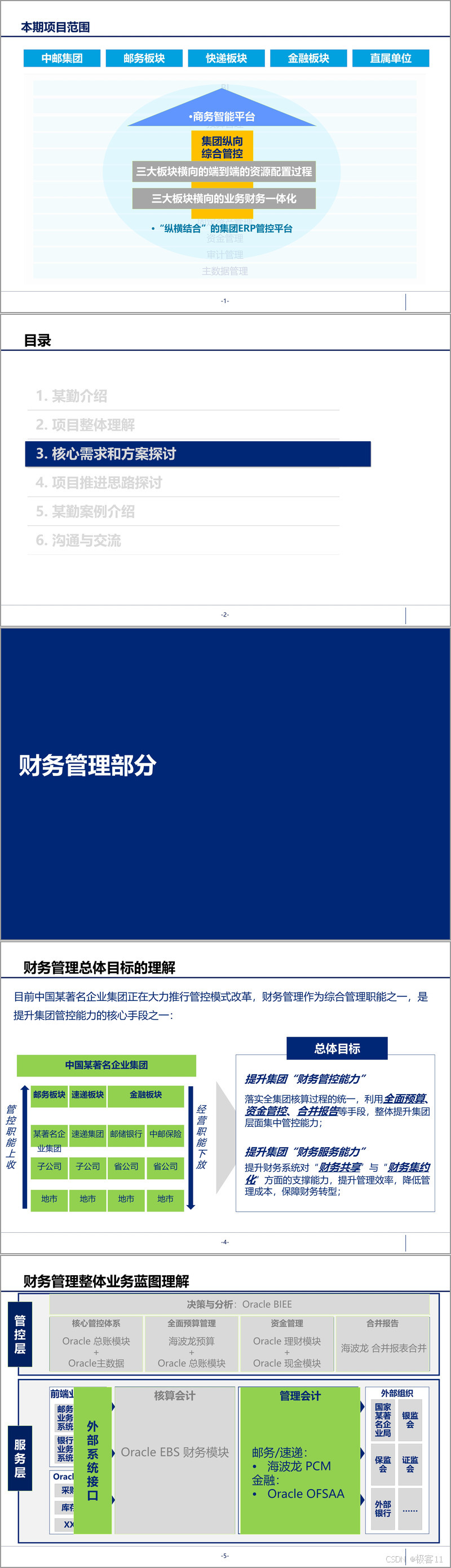 项目整体理解部分聚焦中邮集团的业务特性与转型需求。中邮集团形成了邮务、速递、金融三大业务板块,位列世界 500 强,业务网络覆盖全国,具备板块协同、一体化服务等特点。对标国际一流企业,中邮集团在运营控制与业务创新方面存在提升空间,面临宏观政策调整、互联网技术冲击、传统体制束缚等多重挑战。对此,文件提出通过强化集团综合管理职能与专业板块生产经营职能,构建 “3 纵 N 横” 的信息化总体架构,采用 “统筹规划、试点先行、逐步推广” 的思路,搭建覆盖三大板块的 ERP 管控平台,实现集团纵向集中管控与板块横向业务协同。