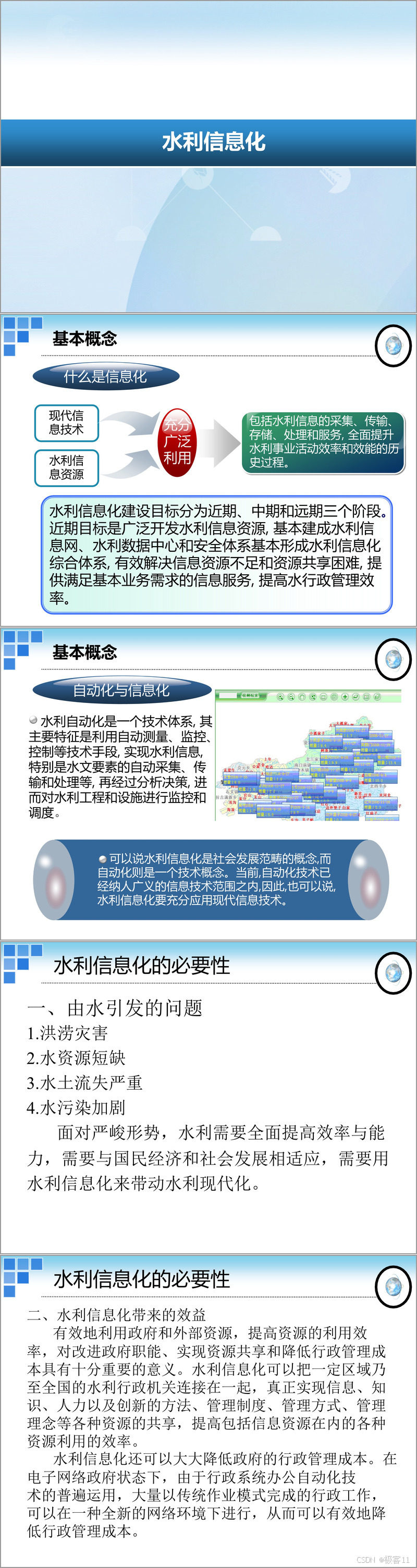 本方案聚焦水利行业数字化转型需求,构建了覆盖监测、预警、管理、决策全链条的智慧水利信息化体系,整合物联网、3S、大数据等现代技术,为解决洪涝灾害、水资源短缺、水土流失、水污染等行业痛点提供了系统性解决方案。方案兼具理论深度与实践可行性,形成了 “基础理论 - 核心系统 - 技术设备 - 应用落地” 的完整架构。