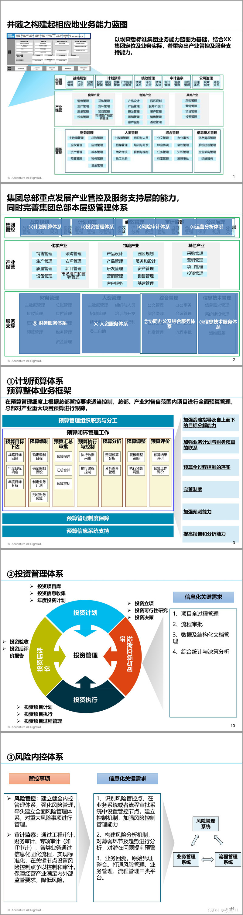 方案开篇明确集团战略挑战与管理需求,提出总部向产业投资核心的六大平台转型,即服务共享、文化融合、风险控制、资源配置、战略发展、运营分析平台,同时明确产业板块集约化、专业化运营的定位。基于埃森哲标准业务能力蓝图,方案梳理出集团总部需重点强化的产业管控及服务支持能力,涵盖财务、人资、战略规划、投资、风险等八大核心体系。
