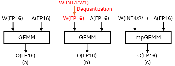 (a) GEMM, (b) Indirect mpGEMM with dequantization, (c) Direct mpGEMM for low-bit LLM inference