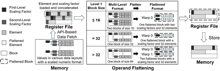 近两年的AI加速器升级,集中体现为三条主线: (1)算术密度:以FP8/FP6/FP4及micro-scaling类格式为代表的低比特浮点与标度化数制,要求硬件原生支持缩放元数据与混合精度的流水化处理(不仅是运算核,还包括寄存与访存路径)。例如,ISCA’25提出的Avant-Garde即把“多层级标度格式”作为一等公民(First-class Citizen),在前端将多样数制折叠为单层内部表示,减少格式转换与调度开销,从而把“数制多样性→算术密度提升”落到微架构层面(如下图)。ACM
