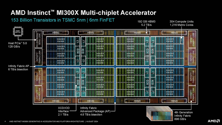 类似地,AMD在MI300系列GPU上首次大规模采用chiplet设计,并通过Infinity Fabric实现了跨芯片通信(如下图)。