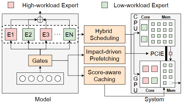 这也推动了 GPU / ASIC 必须将“跨域搬运、分阶段调度、跨格式核心控制”等调度控制面下沉到硬件层设计中: 包括调度逻辑从上层软件下放到硬件,支持异构计算调度。例如,HybriMoE 就体现了此趋势:它通过 CPU-GPU 协同调度策略,实现实现内存调度与 cache 管理 。arxiv