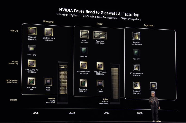近年来,随着大规模模型(尤其是大型语言模型,LLM)的飞速发展,AI 基础设施面临着巨大的挑战。大规模训练对硬件性能、推理效率和分布式计算提出了前所未有的要求。为了满足这些需求,学术界和工业界在AI加速器硬件方面纷纷展开创新。NVIDIA、AMD、Google等公司持续推出新架构以提升AI性能。例如,NVIDIA 已公布面向2026年的“Rubin”架构(代号Vera Rubin),其第一代GPU配备8片HBM4E,单卡显存高达288GB,并引入NVLink 6代互联、1600Gb/s InfiniBand高速网络和X1600交换芯片等新技术tomshardware(如下图)。