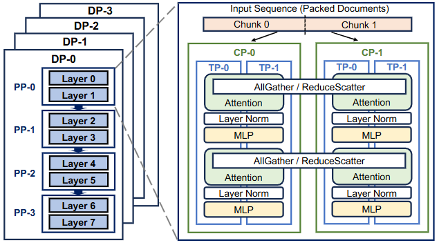 与此同时,模型侧的“多维并行”正在走向工业标准。Meta 的 Llama 3 工程论文把“4D 并行(FSDP × 张量并行 × 流水线并行 × 上下文并行,如下图)”公开成体系:他们在1.6 万块 GPU上,把模型切分、层内并行、流水线调度和长上下文切片协同推进,来换取“能训得动、还要训得快”的平衡 (AIsystem) 。对普通大众而言,关键信息是——如今的大模型,已不是“把参数丢给一堆显卡”这么简单,而是把时间线与数据路由都并行化。