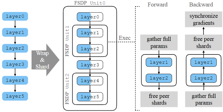 PyTorch社区发展出Fully Sharded Data Parallel (如下图,pytorch, arxiv),在训练过程中按层对模型参数进行分片和重组,实现近乎线性可扩展的内存优化。