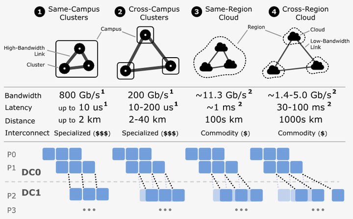 再往外看,训练规模已经超出单个机房。USENIX ATC 的 CrossPipe (USENIX)显示:跨机房训练会被高时延/低带宽“卡脖子”(如下图),必须把pipeline scheduler和数据并行通信放在同一个优化框架里,才能把“等网络”的时间压下去。这让“跨地域的协同并行”成为下一步的硬题,也解释了为什么数据中心与运营商,都在讨论面向 AI 并行的网络/光互联改造。