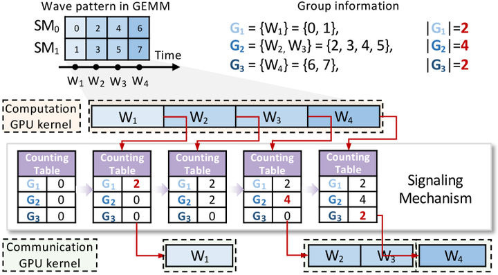 更强的通信–计算重叠:FlashOverlap(如下图,ar5iv):识别 GEMM 的tile→wave完成序规律,基于信号触发与重排实现tile/wave级的通信启动,不改变 GEMM 主逻辑,也不要求定制通信核,因而通信无关、干扰最小,在多 GPU(尤其消费级 PCIe)下可达 1.65× 加速。
