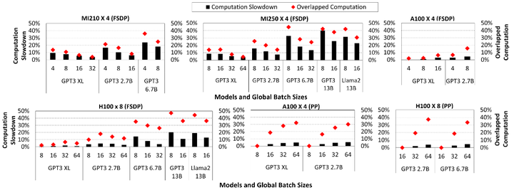 GPU 上的重叠(如下图,arXiv)表征研究给出更系统的性能模型与可重叠性边界,为“是否值得再细粒度拆分/融合”提供定量依据(如对 GEMM+AllReduce/GEMM+RS 的分析,如下图说明计算-通信重叠会带来显著的计算减速,特别是在 FSDP 和小 batch 下,而流水线并行受影响较小)。