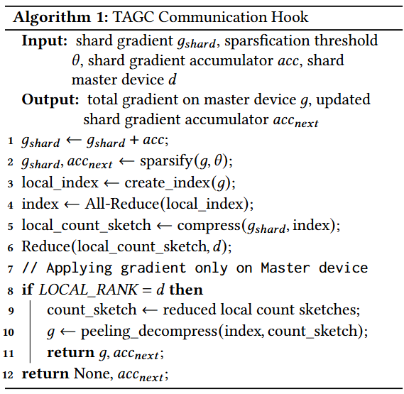 梯度压缩/稀疏化与变体: TAGC(Transformer-Aware Gradient Compression,arXiv):把同态无损压缩(LHC)迁移到 FSDP 的分片场景,并结合层选择与动态稀疏化(伪码如下);在低带宽时对 FSDP 有最高 ~15% 加速。