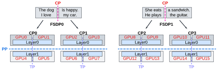 A two-layer LLM is sharded across 16 GPUs using 4D parallelism