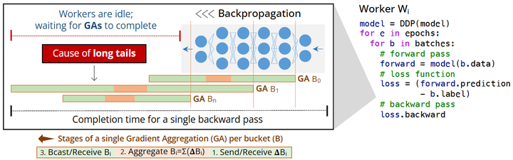 经典 DDP(Distributed Data Parallel)在每个 worker 持有一份完整参数,前后向各自计算梯度后做AllReduce 平均。为隐藏通信,框架将梯度按“桶(bucket)”打包并在反向图回溯过程中边计算边聚合;但现实集群存在慢节点/拥塞导致尾部延迟,形成“长尾阻塞”(如下图,USENIX)。
