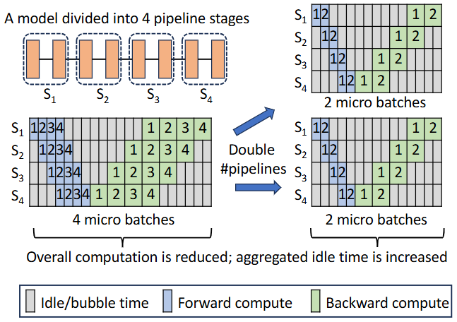 更现实的难题是:流水线(Pipeline)里的“空转时间”(气泡,bubble)非常多。特别是在大规模流水线并行里,GPU 的空等时间常年 15%–30%,极端能超 60% (如下图例子,MLsys)。这告诉我们,优化并行≠只改模型,更是把时间切干净的工程学。