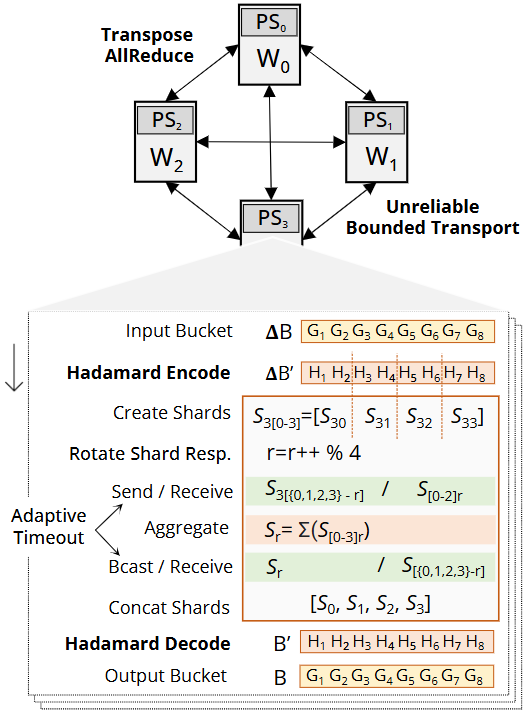 NSDI’25 的 OptiReduce (USENIX,如下图)从集体通信(collective communication)侧切入:用Transpose AllReduce(TAR)、有界不可靠传输(UBT)与Hadamard 变换把“允许少量梯度丢失/近似”纳入系统设计目标,显著降低回合数与最慢路径占比,从而压缩 AllReduce 的 99 分位时延并提升 TTA(Time-to-Accuracy)。
