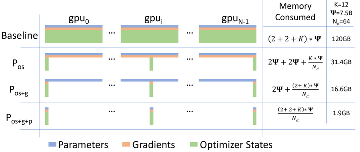 为降低数据并行的内存和通信开销,研究者提出了一系列优化技术。例如,微软提出的ZeRO(如下图,arxiv)系列方法通过显存优化将优化器状态、梯度和模型参数在进程间按块拆分,减少每个GPU需持有的数据副本。