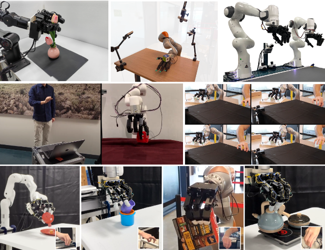 内容简介:这篇工作把“人手”变成学习灵巧操作的通用接口。难点在于人手与各式机器人手之间存在巨大的体态差距(embodiment gap):运动学不一致、视觉外观不同、触觉信号也不同。DexUMI提出硬件 + 软件两层适配:硬件是一套可穿戴手部外骨骼,强制让演示动作落在目标机器人手的可行空间里,同时记录近似于机器人端的关节与触觉;软件端用视频分割 + 机器人手修复/“换手”补绘把人手演示的视频转成“仿佛机器人亲自操作”的训练素材。这样一来,数据采集不必依赖实时遥操作,效率更高,且同一套流程可迁移到不同形态的灵巧手(如 Inspire、XHand)。实机实验显示多个任务上有较高成功率,说明“人手即接口”的思路确实能缩小跨硬件的落差。