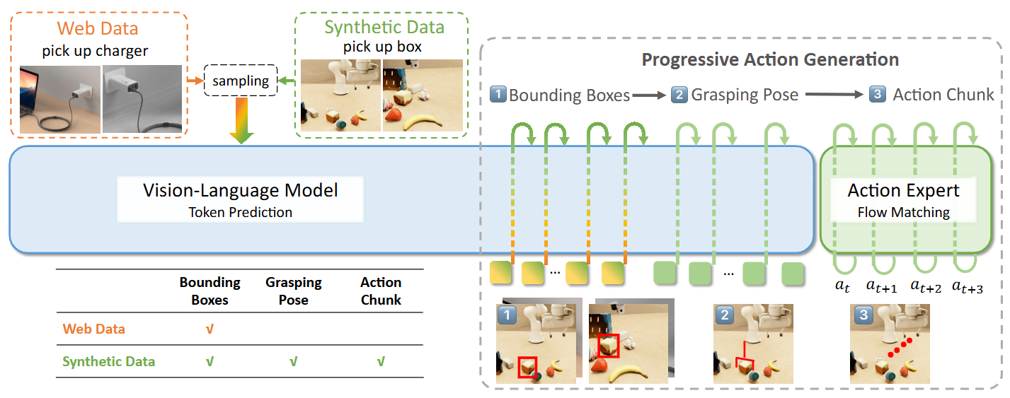 - 多技能动作头(N 个):每个技能各有一个“动作头”,直接从 Readout 表征解码该技能的动作(位姿 + 吸取开关等);这样把长任务拆成可复用的技能,降低单一策略直接覆盖全流程的难度。